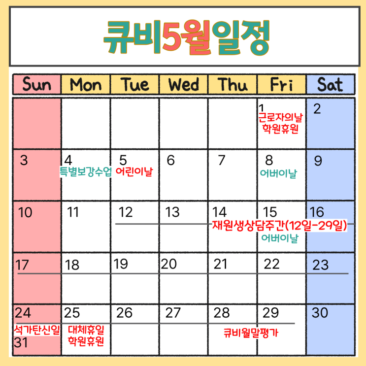 대천동학원 큐비학원 5월 일정 안내 | 신월초학원 학부모님께 전합니다(신월초 한샘초 용천초 학원) 안녕하세요. 대천동학원 큐비입니다. 따뜻한 햇살이 가득한 5월, 가족의 소중함을 느끼는 계절입니다. 각 가정에 웃음과 행복이 늘 함께하시길 바라며, 아이들의 성장 또한 풍성하게 이어지길 응원합니다. 큐비는 이번 달에도 성실한 지도와 세심한 관리로 믿음에 보답하겠습니다. 5월 주요 일정 1일(목) 근로자의 날 : 휴원 4일(월) 특별보강 5일(월) 어린이날 8일(목) 어버이날 12일~ 29일: 재원생 상담주간 운영 24일(토) 석가탄신일 25일(일) 대체휴일 :휴원 28(목)~29일(금): 월말평가 공휴일 특별보강 안내 5월은 쉬는 날이 많아 학습 흐....... <img src="https://blogthumb.pstatic.net/MjAyNjA0MjhfMjUx/MDAxNzc3MzcxNzAzNzI0.Jy7OR832hOJXEYmVd7I9k10SDkP1grupvwUP_huessIg.Op92hnaJydi1PiPNjpJYoVfPCMNgdJUco_zdidS6fMEg.PNG/%C1%A6%B8%F1%C0%BB_%C0%D4%B7%C2%C7%D8%C1%D6%BC%BC%BF%E4._%286%29.png?type=s3" />