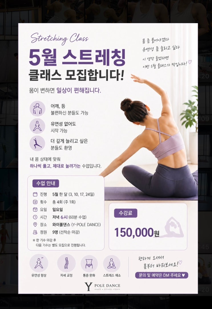 요즘 몸 여기저기 불편하신 분들 많죠. 단순히 유연성 늘리는 스트레칭이 아니라, 아프고 뻐근한 부분을 풀어주면서 몸을 더 편하게 만들어드리는 수업입니다. 굳어있던 근육을 풀어주는 것도 중요하지만 그 상태에서 끝나는 게 아니라 다시 불편해지지 않도록 필요한 힘까지 같이 채워드리고 있어요. “스트레칭 = 유연한 사람만 하는 거” 이렇게 생각하셨다면 오히려 지금 더 필요한 수업일 수도 있어요. 처음이신 분들도 부담 없이 오셔도 됩니다 몸이 조금씩 편해지는 걸 직접 느끼실 수 있을 거예요. [수업 안내] ✔ 진행 : 5월 한 달 (3, 10, 17, 24일) ✔ 횟수 : 총 4회 (주 1회) ✔ 요일 : 일요일 ✔ 시간 : 저녁 6시 (90분 수....... <img src="https://blogthumb.pstatic.net/MjAyNjA0MjVfMTQ1/MDAxNzc3MTIxNDIwMDY3.IV_0R2KtVrBVFzk2wCag7aCtUvuMbQ1wLnE49xvQHtEg.vGmtobn73ySXU-2hrmi5SDp-gLHtgH0NtNl2Ro-Gd9Yg.JPEG/IMG%A3%DF9110.jpg?type=s3" />