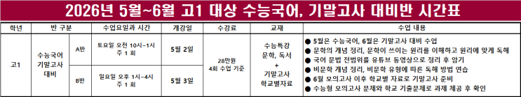 양병철 국어학원 5월~6월 신규생!!! 5월은 6월 모의고사 대비 수능국어 수업 6월에는 학교별, 학년별 기말고사 대비 수업 5월 수능국어 수업 후 6월 모의고사 이후에는 학년별, 학교별로 수업 시간을 정해 준 후 기말고사 대비 수업을 진행합니다. 고3, N수생 중 수능국어 수업만 원하는 수험생은 6월에도 수능국어 수업을 진행합니다. 학교별, 학년별 시간표는 수업을 듣는 학생들과 얘기해서 시간표를 만듭니다. 수업을 듣는 학생들은 학교와 인원에 상관없이 기말고사를 완벽하게 대비해 줍니다.^^ <img src="https://blogthumb.pstatic.net/MjAyNjA0MjVfMTMx/MDAxNzc3MDkwMzA2MzIw.hZTVrxMWglCQYFyiuT1H4kz0M6HjwhO3eS6VGoboxdIg.bND95cJM_qJS5Xafd_qzvTTP0anoxzAvu80mKNR776gg.PNG/2026%B3%E2_5%BF%F96%BF%F9_%B0%ED1_%B1%B9%BE%EE_%BD%C3%B0%A3%C7%A5.png?type=s3" />