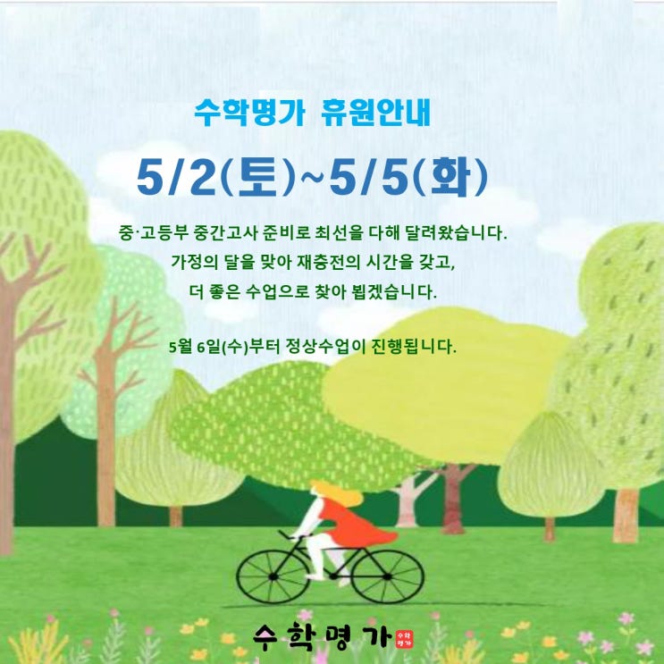 안녕하세요 수학명가학원입니다 휴원기간 5/2(토)~5/5(화) 5월 6일 수요일부터 정상수업합니다. <img src="https://blogthumb.pstatic.net/MjAyNjA0MjdfMTA1/MDAxNzc3MjgwNTgwODM2.RCcAh8VJmam2qBSInKUVvzadFL6G0JU1Oc8AvtyHh-Ig.dMlHJW6SzlKAuPMxCpsvthLOh89-_c2sF7soSjUyQ7Ug.JPEG/5%BF%F9_%C8%DE%BF%F8%BE%C8%B3%BB_page-0001.jpg?type=s3" />