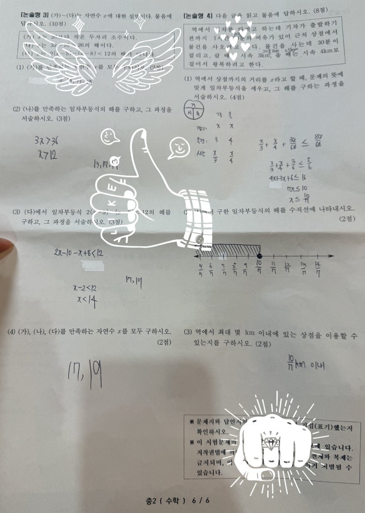 라라중 2학기 1학기 수학 서술형 문제입니다. 시험문제가 쉬웠다한들 정해져 있는 시간내에 문제를 다 풀고, 서술형의 식을 어쩜 이렇게 깔끔하게 잘 썼는지~~ 학교 선생님께서도 다른 학생들에게 모범 답안으로 보여주셨다하니 OMR 카드에도 정말 잘 옮겨적었나봅니다. 개념노트 2. 수학 오답노트, 영어 직독직해 3. 백지테스트 다 적어, 또 적어, 맨날 적어~~ 꾸준함이 습관이 되고, 습관이 곧 실력이 됩니다!!! <img src="https://blogthumb.pstatic.net/MjAyNjA0MzBfMjQg/MDAxNzc3NDgxNTk5NTUw.LvUQGTyVZVUaqDj9VtpjZPsPYXWdSikTA3yeRxOZKMEg.QfJcaL7dCoSuU0cySAXx4vaP6JIbfcwnqate9N8Np2wg.JPEG/KakaoTalk_20260428_205936950.jpg?type=s3" />