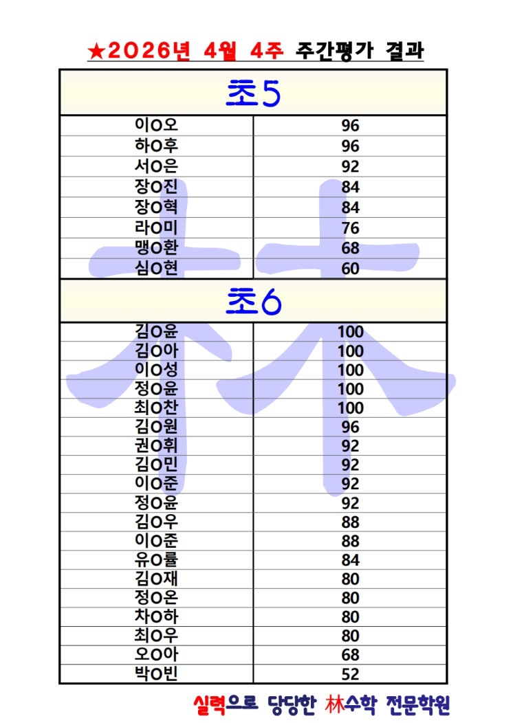 천안 임수학전문학원의 2026년 4월 4주 주간평가 결과입니다.