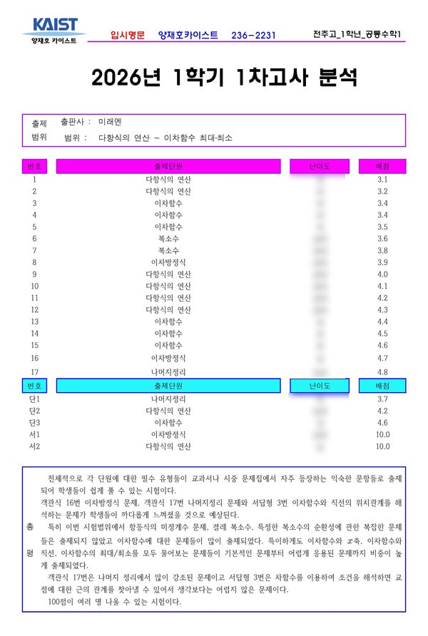 전주고 1학년 1학기 1차고사 공통수학1분석 전주 중★고등 입시수학의 표본인 전주 수학학원 양재호카이스트학원입니다. 이번에는 전주 전주고 1학년의 공통수학1, 2026년 1학기 1차고사를 분석하여 보겠습니다. 위의 내용 중 난이도는 양재호카이스트학원의 내부자료입니다. 그런 이유로 블로그에서는 모두 공개할 수 없음을 양해바랍니다. 학원에 내원하시면 열람가능합니다. ^^ 중화산동 수학학원 양재호카이스트학원에서는 전주에 있는 중★고등학교의 기출을 항상 분석하고 기록으로 남기고 있습니다. 아직 시험을 보지 않은 학생들에게는 좋은 자료가 되고 또한 내년, 내후년에 후배들에게는 많은 도움이 되기도 해서입니다. 그리고 시험직....... <img src="https://blogthumb.pstatic.net/MjAyNjA0MjRfMjIx/MDAxNzc3MDM5MTQ2ODI1.oM5PP0FCNeMbmBbS_PGyN298vjCPSfFqiGZDpGGpFvEg.rVJN7h7rreln7uKbivdsU4vpcs1TVWG146j6CQ-_2qUg.JPEG/2026_%C0%FC%C1%D6%B0%ED1_%B0%F8%C5%EB%BC%F6%C7%D01%281%C2%F7%29.jpg?type=s3" />