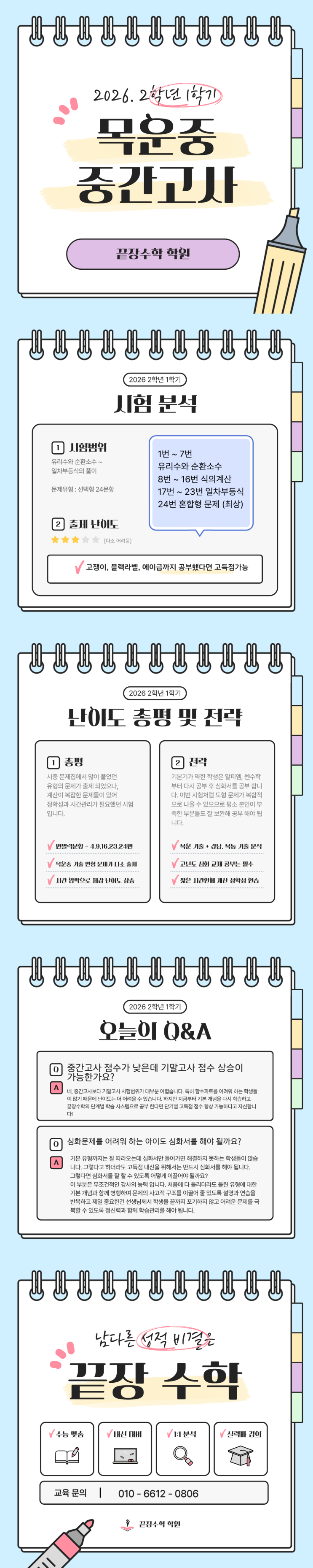 # 목운중 시험이 타 학교보다 내신이 어렵습니다. 중학교 시험이 왜 이렇게까지 어려워 하실 수 있으시겠지만 고등 내신을 잘 준비하기 위해서는 중학교 시험이 어려운게 좋다고 생각합니다. 시험이 어려워도 충분히 공부 하면 90점 이상 받을 수 있는 시험이기 때문에, 지금부터라도 체계적으로 공부를 잘 해 나간다면 다음 시험에서부터 반드시 좋은 성적을 받을 수 있습니다! <img src="https://blogthumb.pstatic.net/MjAyNjA0MjdfMTQz/MDAxNzc3MjY5NzYwNDYz.ORxn3dWc80CgR9XV4bUlfrNBx3KrA75XznV77e62VZkg.H0GC9A9dhjfYIUvS85Qvt6LOsywlM6u5t_PDaanusSUg.PNG/%C1%A6%B8%F1%C0%BB_%C0%D4%B7%C2%C7%D8%C1%D6%BC%BC%BF%E4..png?type=s3" />