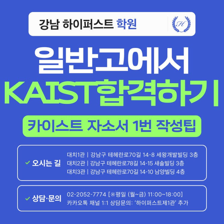 "카이스트 자기소개서 1번 문항, 도대체 뭘 쓰라는 건지 모르겠어요." 해마다 입시 시즌이 되면 일반고 수험생과 학부모님들께 가장 많이 듣는 하소연입니다. 다른 대학 자소서는 본인의 활동이나 협업 사례를 쓰면 되는데, 카이스트는 뜬금없이 '자신만의 질문'을 써내라고 하니 당황스러울 수밖에 없습니다. 특히 화려한 실험 장비나 심화 탐구 기회가 적은 일반고 학생들에게는 이 150자의 '질문'과 800자의 '이유'가 거대한 장벽처럼 느껴지곤 합니다. 하지만, 하이퍼스트는 일반고 학생들에게 1번 문항은 위기가 아니라 기회라고 말씀드리고 싶습니다. 거창한 R&E 활동이 없어도 괜찮습니다. 교....... <img src="https://blogthumb.pstatic.net/MjAyNjA0MjhfODEg/MDAxNzc3MzY3NDUyNTAw.bjHoAG4I7jSgq9KUcAsYWHzPMY6MdMnDFL2rkA-EM18g.KBL4NhEw6Ekn_uju6o4n4vr5zbl4ufIvFZWUMcK7ErIg.PNG/%C7%CF%B4%C3%BB%F6%B0%FA_%B3%B2%BB%F6_%B1%E2%BA%BB%C0%FB%C0%CE_%C4%AB%B5%E5%B4%BA%BD%BA_%B5%F0%C0%DA%C0%CE_%C5%DB%C7%C3%B8%B4_%C0%CE%BD%BA%C5%B8%B1%D7%B7%A5_%B0%D4%BD%C3%B9%B0_%281%29.png?type=s3" />