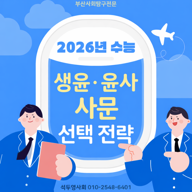 #부산사탐 <석두영사회> #생윤 #윤사 #사문 선택전략 세우기! 수능 사회탐구 과목이 9개나 되기에 과목 선택이 무엇보다 중요합니다. 그중에서도 생활과 윤리(생윤), 윤리와 사상(윤사), 사회문화(사문)는 가장 많이 선택되는 대표 과목입니다. 각 과목의 특성과 조합 전략을 이해하면 수능 준비가 훨씬 효율적이 됩니다. 1) 생활과 윤리(생윤) 생윤은 개인의 삶 속에서 마주하는 도덕적 딜레마와 가치 판단을 중심으로 다룹니다. 현실 사례 기반의 문제가 많아 단순 암기보다는 상황 적용 능력이 중요합니다. 사회문화와 함께 선택되는 전통적인 조합으로, 사고력과 응용력을 함께 키울 수 있습니다. 2) 윤리와 사상(윤사) 윤사는 동서양....... <img src="https://blogthumb.pstatic.net/MjAyNjA0MjlfMjM0/MDAxNzc3NDQyOTE5NTYx.ZcR6y0L3KHlhzvBTMgpqeJkh18U4EWMYXGlBI9Hm_90g.B50SU-xaNdBbvCtymTGbkLAvycpKRLXP1AkEz4MDqncg.PNG/Copilot_20260429_150822.png?type=s3" />