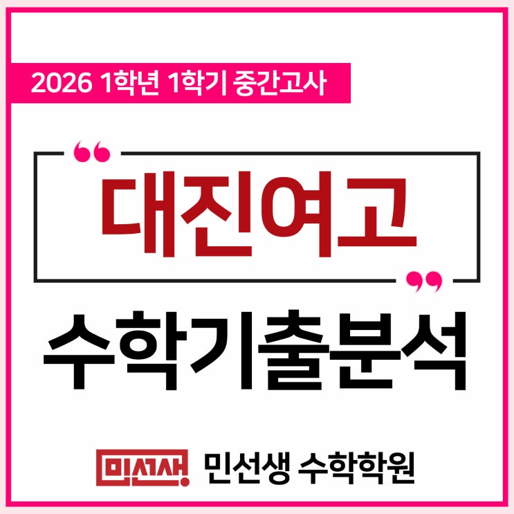 안녕하세요. #은행사거리수학학원 민선생 수학학원입니다. 민선생 수학학원의 고등부 선생님들이 분석한 자료입니다. 대진여고의 재원생 혹은 학부모님들께서, 대진여고 수학내신의 출제경향과 주요문항을 이해하는데 도움이 되시길 바랍니다. 대진여고 1학년 1학기 중간고사 내신분석 들어갑니다! 전통적인 수학 강세 학교인 대진여고의 이번 1학년 1학기 중간고사는 학교 부교재(올림포스 유형편)의 완벽한 숙지와 고난도 모의고사 기출 문항에 대한 적응력이 등급을 결정짓는 핵심이었습니다. 1. 문제유형 및 배점 2. 시험범위 공통수학1 다항식의 연산 ~ 이차함수의 최대최소 3. 이번 시험의 특징 1.높은 출제 난이도: 대진여고 수학은 단순....... <img src="https://blogthumb.pstatic.net/MjAyNjA0MzBfMjE2/MDAxNzc3NTQ3MDU2NDI5.nsaJCP-6uSAAl_nmt3R2AFDTW0oNQFy0fStlf4f2-CIg.vvxQ3qckXi1CLtr2VSsPdwujjIYptXtfwe3BjJbh2Xog.JPEG/%C1%A6%B8%F1%C0%BB-%C0%D4%B7%C2%C7%D8%C1%D6%BC%BC%BF%E4_-001.jpg?type=s3" />