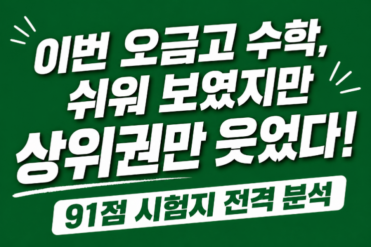 이번 오금고 1학년 수학 중간고사는 겉보기보다 훨씬 까다롭게 출제된 시험이었습니다. 2026 오금고 1학년 1학기 중간고사 수학 분석ㅡ공통수학1 시험지 완벽 분석 (다항식·복소수·이차방정식·이차함수) 이번 오금고 1학년 1학기 중간고사 공통수학1 시험은 표면적으로는 기본 범위였지만, 실제로는 상위권 변별력이 매우 강하게 설계된 시험이었습니다. 우리 VIP학원 학생 중 91점 고득점 사례가 통해 시험지를 철저히 분석해 보았습니다. 결론부터 말하면, “개념만 공부해서는 절대 고득점이 나오지 않는 시험”이었습니다. 전체 시험 난이도 총평 객관식: 중상 난이도 서답형: 상 난이도 전체 난이도: ★★★★☆ (상) 특히 이번 시....... <img src="https://blogthumb.pstatic.net/MjAyNjA0MjVfMTEg/MDAxNzc3MTE3MDcyODMz.oMJkLzQnUY6SRudBtNR63X9S24dn5oBZjYR0_62wwCMg.4j07W6ooWSWxqLizHDWruZTzqau83VaB1buC4QG0uj4g.PNG/900_file_00000000268472098f84c47604cff419.png?type=s3" />
