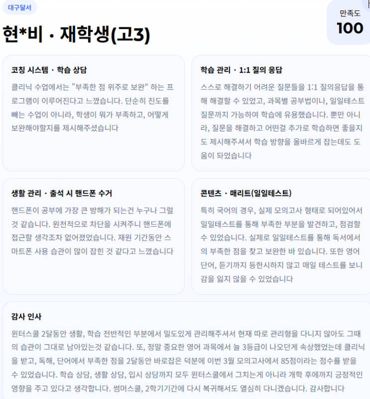 안녕하세요 이투스247대구달서점 입니다. 지난 이투스재원후기 공모전 이벤트에서 대구달서점에서는 총 5명의 졸업생이 당첨이 되었는데요! 모두 글을 너무나 잘 써준 덕분에 저희 대구달서점이 어떻게 관리를 하는지, 어떤 부분이 좋았는지 한눈에 알아 볼 수 있어서 그 생생한 후기들을 공유 합니다. 윈터스쿨을 다녔었던 현0비 졸업생! 26윈터때는 클리닉 수업 2개를 들어야 했는데요, 현0비 졸업생은 영어클리닉 수업이 잘 맞았던것 같네요 클리닉 수업태도도 너무 좋았고, 학원 시스템도 잘 따라와 준 모범학생 좋은결과가 있어서 다행입니다 이대로 수능까지 계속 쭉쭉 올라가기를 !! 역시 윈터스쿨을 졸업한 문0연 졸업생 윈터때는 매일매....... <img src="https://blogthumb.pstatic.net/MjAyNjA0MzBfMTU1/MDAxNzc3NTEwMjQ2MzIw._s9tOfC110JThOC0AIjnV_JcZqSrq1gCp-3mN0AxUJwg.1FLk4kp0nHBhFS3x2WA6FId3_hUvTzrzcQbqSukPx3Ag.PNG/image.png?type=s3" />