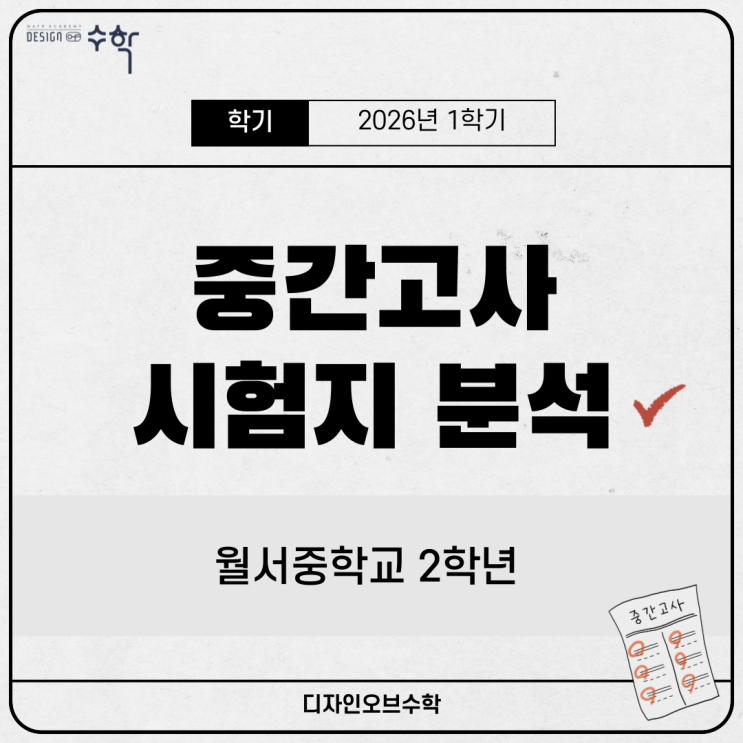 안녕하세요. 수학을 디자인하여 내신과 수능, 입시까지 완성하는 디자인오브수학입니다. 학생들의 수학 학습에 도움을 드릴 수 있도록 학교별 중간고사 시험지 분석을 해드립니다 월서중학교 2학년 1학기 중간고사 수학 시험지 분석표입니다. 디오수 선생님들이 꼼꼼하게 분석하였습니다. 마지막까지 꼭 확인해 주세요! ※ 저작권 문제로 일부 문제 내용은 모자이크 하였으니 양해 부탁드립니다 ♡ ◆ 총평 및 학습 전략 이번 월서중학교 2학년 수학 시험은 개념을 확실히 이해하고 있는지 묻는 기초 문항부터, 복합적인 연산 능력을 요구하는 응용 문항까지 고르게 분포되었습니다. 특히 유리수와 순환소수 및 단항식과 다항식의 계산 파트에서....... <img src="https://blogthumb.pstatic.net/MjAyNjA0MzBfNjkg/MDAxNzc3NTMwNDQ2Njk5.tLiHs2VCWckmN87wl2U75yRyr7LYBr8GIf0-Dj0swfkg.vVpf2hQeS0pkNLzjno-j3UtZzE8pWXQ_3ETAwWLWtwIg.PNG/%BD%C3%C7%E8%C1%F6-%BA%D0%BC%AE-%C7%A5%C1%F6-%BC%F6%C1%A4-003.png?type=s3" />