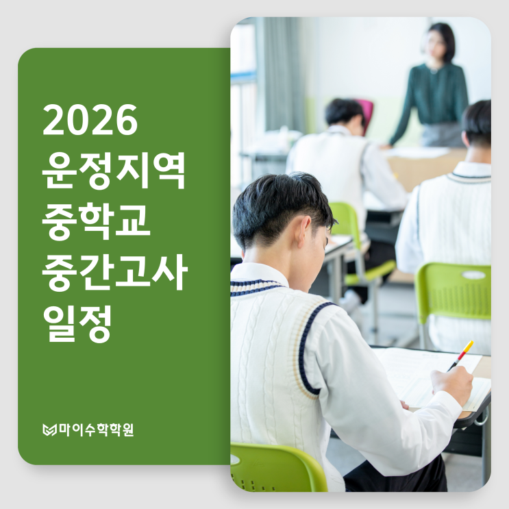 안녕하세요 운정 중등 마이수학학원입니다. 따뜻한 봄기운과 함께 어느덧 1학기 중간고사 기간이 코앞으로 다가왔습니다. 우리 파주 지역 중학생들이 수학 과목에서 그동안 노력한 만큼, 아니 그 이상의 성과를 낼 수 있도록 산내마을수학학원이 함께 달립니다! 먼저, 운정 지역 주요 학교들의 시험 일정을 정리해 드립니다. 꼼꼼히 체크해 주세요! 주요 학교 1학기 중간고사 일정 다율중 동패중 산내중 산들중 심학중 운정중 운정중앙중 지산중 한가람중 해솔중 TIP: 대부분의 학교가 4월 마지막 주에서 5월 첫째 주 사이에 시험을 치릅니다. 정확한 과목별 시간표는 각 학교 홈페이지 '가정통신문' 게시판을 한 번 더 확인....... <img src="https://blogthumb.pstatic.net/MjAyNjA0MjBfNDgg/MDAxNzc2Njg1OTI1Mzgw.d9GYMz7m23QsaWD7_WI4BpVV2aLQd3XJuu-DpsotqmQg.7szedTfUDBrslnySOj3uRIhDeyDZbT3T5orOQcUiFh8g.PNG/1.png?type=s3" />