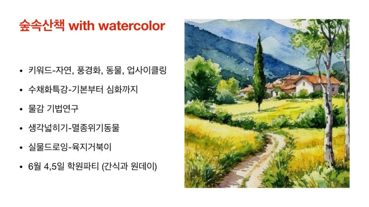 안녕하세요 원장크크입니다 봄이 오는듯 하더니 여름이 시작된것 같아요~ 아침저녁 기온차가 심한데 우리 크크 가족들 모두 감기 조심하세요 5월 6월은 어떤 주제가 기다리고 있을지 기대되시죠? 개봉박두!! 5-6월 홍이크 유니크의 주제는 '숲속산책 with watercolor' 입니다 숲속산책 with watercolor 아름다운 자연은 오랫동안 미술의 가장 소중한 소재였습니다. 풍경화 정물화(과일, 야채) 동물화 등등 하나씩 깊게 탐구하며 만나볼게요 더불어 수!채!화! 물감사용이 익숙해지려면 반복과 연습이 필요합니다 그!러!나! 요즘 친구들은 반복과 기다림을 참 어려워해요 그!래!서! 재미있게 의미있게 배우는 수채화 킥!! 비법들을 마구....... <img src="https://blogthumb.pstatic.net/MjAyNjA0MjFfMjY1/MDAxNzc2NzM0NTI3OTE0.JN0Hcvg_AE0puPVj-QHMyx5lURxfFmXUCfP9CmaRs58g.shQm8lP38zPH550RI3QiLvffUVTT2YbMWSC7APODPJog.JPEG/IMG_3943.jpeg?type=s3" />