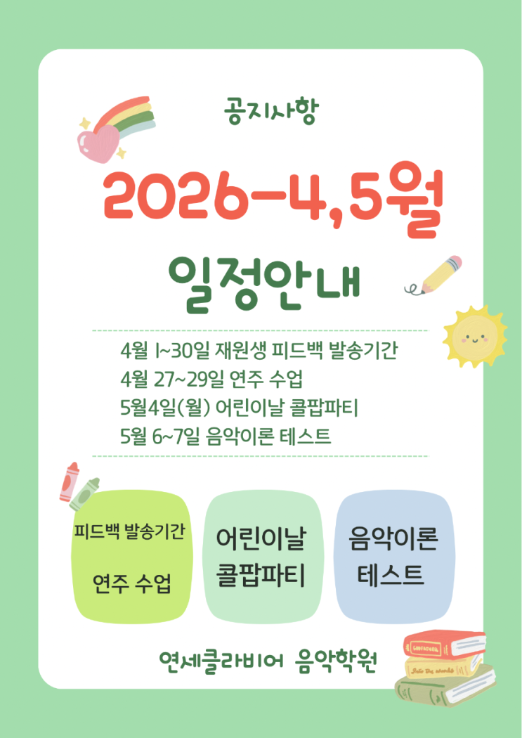 [소담동 피아노 연세클라비어 음악학원] 2026-4,5월 일정 및 휴원일 안내
