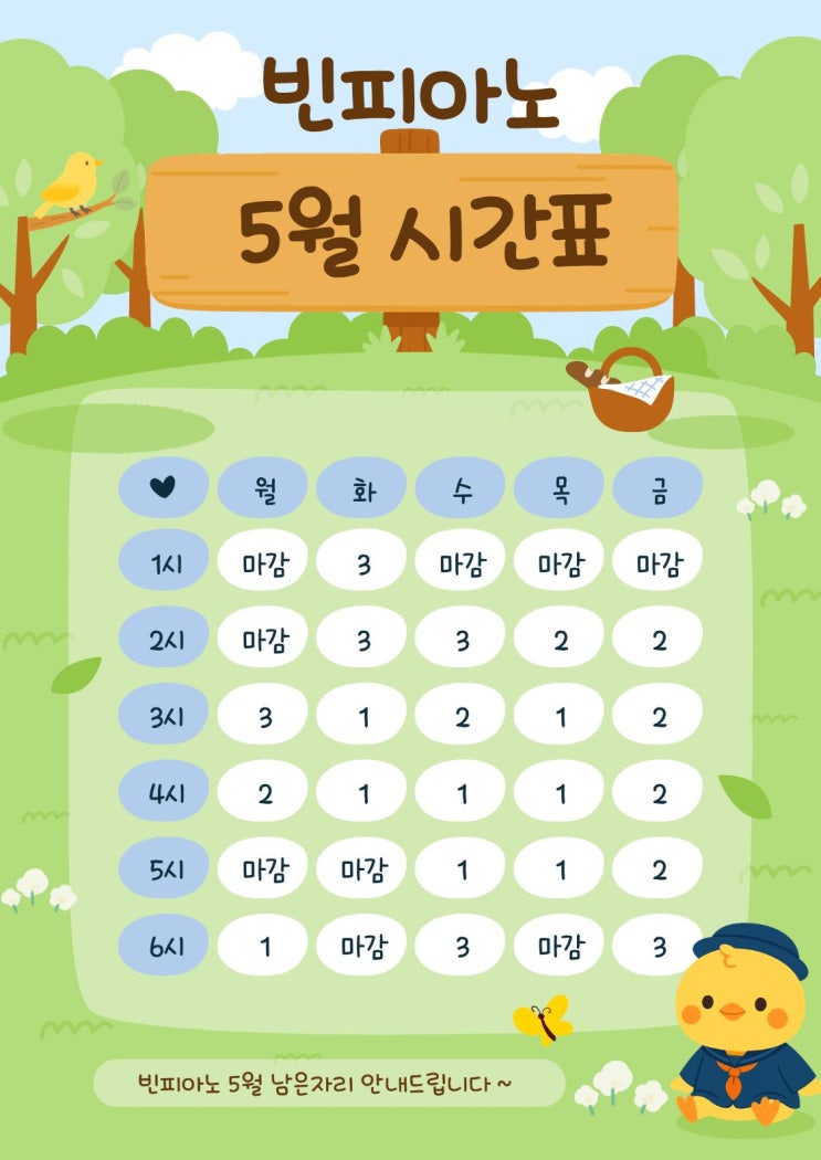 안녕하세요 빈피아노 입니다 ~~ 3,4월 신입생과 재원생들 시간표 변동이 많아 원하시는 시간대 등록 못하는 경우가 있었는데요ㅜㅜㅜ 미리 5월 빈 시간표 자리 안내 드립니다 !! 월 : 3시30분, 4시, 6시 화 : 1시, 1시30분, 2시,2시30분, 3시, 4시 수 : 2시 30분, 3시, 4시, 4시30분, 5시, 5시30분, 6시 목 : 2시, 2시30분, 3시, 3시30분, 4시, 4시30분, 5시 금 : 2시, 2시30분, 3시, 3시30분, 4시, 4시30분, 5시, 5시30분, 6시 스케줄 확인 후 문자나 톡톡 남겨주세요 ㅎㅎ ex) 박00, 화 2시, 관양초 2학년 010 5671 3849 --------------------------------------------------------------------- 빈피아노는 다릅니다 !! ★개인 맞춤 레슨 진행....... <img src="https://blogthumb.pstatic.net/MjAyNjA0MjVfMjQ2/MDAxNzc3MDg5NDMzNDc2.vcYWtDLzGC9Q2qtehD0UEzuvFf7f7Tn7iMJsd34xKl4g.pMQjaPk-dY_wSWAFRhm2sJiGIurRSXM2DKkN1LWVzC4g.JPEG/%C1%A6%B8%F1%C0%BB_%C0%D4%B7%C2%C7%D8%C1%D6%BC%BC%BF%E4._%284%29.jpg?type=s3" />