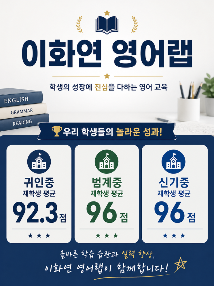 안녕하세요. 이화연영어랩입니다. 저희 원은 암기로 시험대비를 하지 않습니다. 중등 때 그렇게 공부하면 고등에서도 도움이 되지 않기때문입니다. 그 습관 그대로 올라가면 오히려 큰 부담이 됩니다. 고등 영어는 단순 암기가 아니라, 문법 개념을 기반으로 오류를 분석하고 정확한 독해로 내용을 이해하는 것이 핵심입니다. 중등과 고등의 차이는 생각보다 큽니다. 그래서 시험 대비 방식부터 미리 바꿔야 합니다. ✔ 암기 중심 → 분석 중심 ✔ 해석 흉내 → 정확한 독해 ✔ 찍기 감각 → 근거 기반 풀이 공부 방식이 바뀌면, 결과도 바뀝니다. 그것이 중등 뿐만 아니라 고등을 대비하는 현명한 방법입니다. 귀인중 재학생 평균 92.3점 범....... <img src="https://blogthumb.pstatic.net/MjAyNjA0MjlfMjc2/MDAxNzc3Mzg5MzA2NzQ3.5gkBhZcoD4girVMkwsLtXpfbNOne7bhfMX4GLqkZx9kg.IGlX7UIBsAR1S7BetrmQou4n24ra9DLFBiRvwm7Xl_wg.PNG/900_file_000000008a40720991a5294b9853e62c.png?type=s3" />