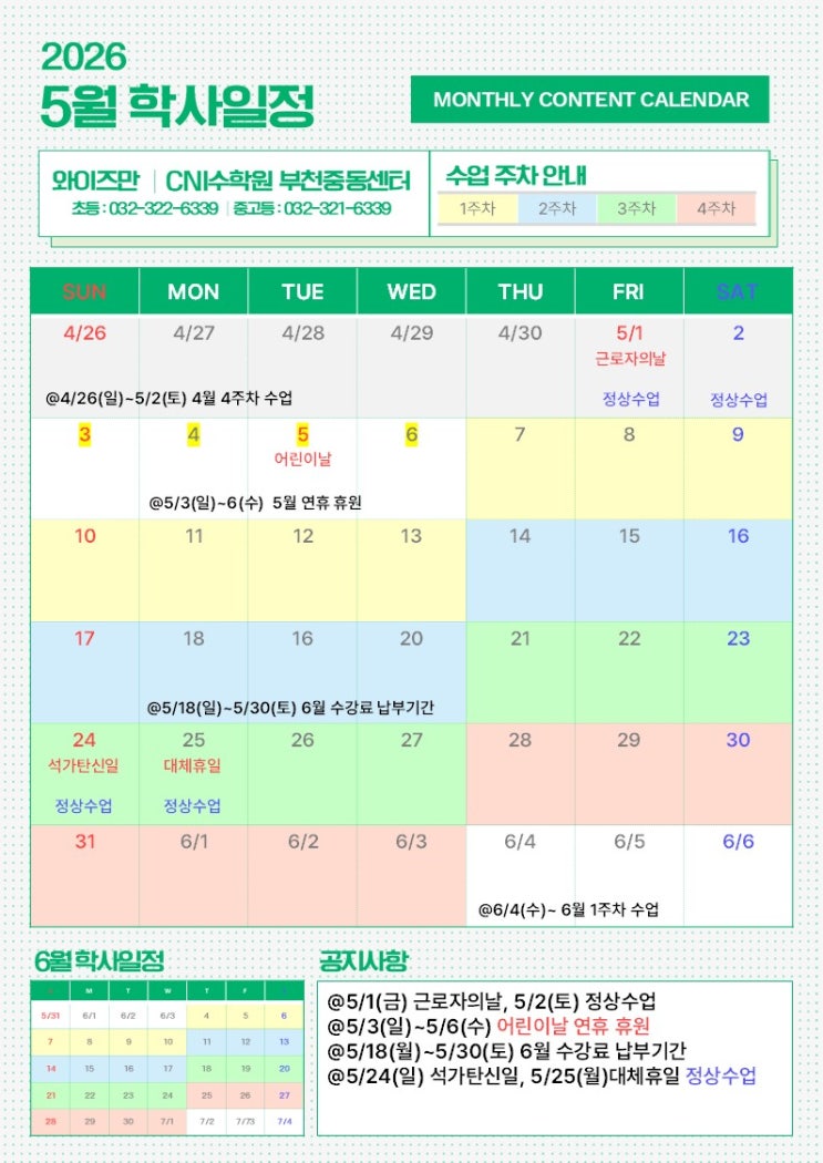 안녕하세요 와이즈만 CNI수학원입니다. 5월 학사일정 안내드립니다. 5월에는 공휴일이 많습니다. 학사일정 잘 확인하시어 일정에 참고부탁드립니다. 결강이 확정됐을시 학원으로 미리 연락하셔서 보강안내를 받으시길 바랍니다. 감사합니다 <img src="https://blogthumb.pstatic.net/MjAyNjA0MjhfNjgg/MDAxNzc3Mzc3MzgwNzA0.NCaCFrP8_bbB-afjy27ZBJz-OyHLzIUv9L4kRBjvbv8g.BPlnlFUG_5XwqgWrs4h8ES3ovN7GJ4FHdIEJj_xt-tog.JPEG/26%B3%E2-%C7%D0%BB%E7%C0%CF%C1%A4-5%BF%F9.jpg?type=s3" />