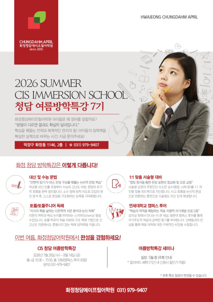 2026 SUMMER 청담 여름방학특강 7기(CIS) 모집 안내! 학부모님, 안녕하세요! 화정청담 에이프릴에서 중학 내신과 수능 고득점의 발판이 될 CIS IMMERSION SCHOOL 7기를 개강합니다. 단편적인 암기가 아닌 문장 구조를 꿰뚫는 전략적 학습! 이번 여름, 아이들의 잠재력을 확실한 실력으로 바꿔보세요. 기간: 2026년 7월 29일(수) ~ 8월 14일(금) (총 13회) 특징: 내신/수능 문법, 1:1 맞춤 서술형, 연세대 캠퍼스 투어 포함! 얼리버드 혜택: 5월 세미나 기간 내 신청 시 할인가 적용 문의: 031-979-9407 https://naver.me/xslhBtSl #화정청담에이프릴 #청담어학원 #여름방학특강 #화정중등영어 #화정영어학원 #고양시영어학원 #내신대비 #수능영어....... <img src="https://blogthumb.pstatic.net/MjAyNjA0MjFfMTY0/MDAxNzc2NzYwNjY0ODE0.O7sPNWu7LXdLwvE48-KAkj6Aa4c3jcZ2AjBIHxQaRdcg.5Os8NeTcgn4aC_jIZoyWCo70Dju4Rj0k9B_Vzj46lqgg.PNG/1.png?type=s3" />