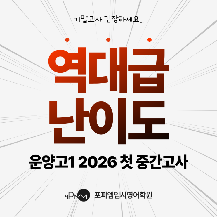 안녕하세요, 포피엠영어학원입니다. 오늘 운양고등학교 1학년 2026년 첫 중간고사가 시행되었습니다. 고등 입학 후 첫 시험인 만큼 학생들의 긴장감이 상당히 높았던 시험이었습니다. 운양고는 그동안 타 과목 대비 영어 난이도가 높은 학교로 알려져 있지만, 이번 1학년 중간고사는 최근 10년 사이에서도 이례적으로 쉬운 난이도로 출제되었습니다. 그 결과, 포피엠 신영목T 운양고1 재원생 67%가 90점 이상, 20%가 100점을 기록했습니다. *시험 당일 기준 - 추가 확인 중 이번 시험은 전반적으로 쉬운 난이도였지만, 이럴수록 상위권은 ‘누가 덜 틀리느냐’의 싸움이 됩니다. 포피엠 학생들은 실수 없이 끝까지 완성하는 훈련이 되어 있었기 때....... <img src="https://blogthumb.pstatic.net/MjAyNjA0MjNfMTc1/MDAxNzc2OTI2MTY1NjQy.tgqy6O9W52HgjULGIVbE6UeHYI0ZVcg1_Naskl2jmYkg.7fOdTfxdFljCwPoYL6IxklLHvRHkQJrbcaG_RwK6TTwg.PNG/%BD%E6%B3%D7%C0%CF3_%284%29.png?type=s3" />