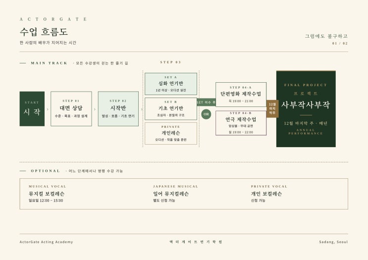 연기를 가르치는 일은 커리큘럼을 나눠 주는 일이 아니라고 저는 오래전부터 생각해 왔습니다. 한 사람이 배우로 지어지는 데에는 각자의 속도와 계절이 있고, 그 리듬을 존중하지 않은 훈련은 결국 몸에 남지 않습니다. 이 흐름도는 제가 이십 년 동안 수업을 해 오면서 지금 이 순간 가장 정직하다고 믿는 길을, 한 장의 지도로 정리한 것입니다. 먼저 마주 앉는 시간 — STEP 01 대면 상담 처음 오시는 분과는 반드시 얼굴을 보고 이야기를 나눕니다. 지금의 수준이 어디인지, 왜 연기를 하려 하는지, 얼마만큼의 시간을 낼 수 있는지. 이 세 가지를 모르는 채 같은 수업으로 묶는 일을, 저는 하지 않습니다. 모든 수강생의 길은 여기서 각자....... <img src="https://blogthumb.pstatic.net/MjAyNjA0MjRfMTE3/MDAxNzc3MDM3NzUwMDQ2.tJqyFNfGRHhuQNLg_SiwM80XeQp9l0bKVyIQ7xNYVhAg.qv0xDeFwKaM0gHkkc6YjW_b95qtKmYfdGBFjPaiBIuYg.JPEG/%BE%D7%C5%CD%B0%D4%C0%CC%C6%AE_%BC%F6%BE%F7%C8%E5%B8%A7%B5%B5_1.jpg?type=s3" />