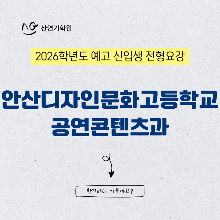 안녕하세요! 산연기학원입니다. 2026학년도 안산디자인문화고등학교 공연콘텐츠과 신입생 전형요강을 알려드립니다. 2026학년도 전형요강 모집정원 2026학년도 모집요강 전형일정 2026학년도 모집요강 제출서류 2026학년도 모집요강 전형단계 2026학년도 모집요강 실기고사 *입시요강은 학교 사정에 따라 변경될 수 있으니 희망하는 학교의 최신공고를 확인해 주세요! 산연기학원은 수험생 여러분을 응원합니다. * 전화:02-582-0271 카톡채널: '산연기학원' 검색 후 상담신청 #산연기학원#신사연기학원#강남연기학원#연극영화과입시 #예고입시#연출학원#기획학원#예술경영학원 <img src="https://blogthumb.pstatic.net/MjAyNjA0MjVfMTgw/MDAxNzc3MDgxMjc4OTQ3.re2YgFOFOXdZAqGp4NYSjuwjXh_wzvUn7j7Hg4po1pUg.lUmESm9PDZDKjPUnwhcvZEvH_pw3OmfBwHa-zvhodhUg.PNG/2027%C7%D0%B3%E2%B5%B5_%C0%D4%BD%C3%BF%E4%B0%AD_%28%BD%C3%C7%E0%B0%E8%C8%B9%29_%2815%29.png?type=s3" />