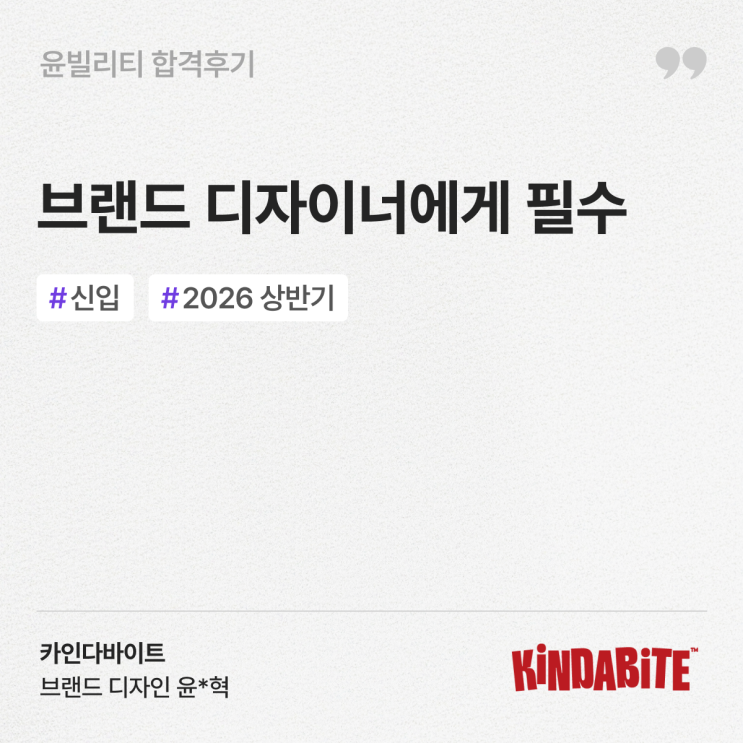 윤빌리티의 주요 기업 디자인 취업률은 약 96%로! 삼성부터, 네이버, 카카오, 현대그룹, LG그룹, CJ, 신한은행, 하나은행, KB 그룹, SK텔레콤, 당근, 무신사 등 수많은 디자이너들이 원하는 커리어 목표를 이루고 있습니다. 오늘은 그 중 2026 상반기 카인다바이트 브랜드 디자인 합격 소식을 소개해드리겠습니다. 카인다바이트 브랜드 디자인 최종합격을 진심으로 축하드립니다 수강생 실제 후기 수강생 분께서 디자인을 예쁘게 만드는 데에서 그치는 것이 아닌, 어떻게 포트폴리오에 설득력 있게 보여주는지, 단순히 보기 좋은 디자인이 아니라 논리적으로 전달하는 방법을 익히신 뒤, 최종 합격 소식을 전해주셨습니다 수강한 클....... <img src="https://blogthumb.pstatic.net/MjAyNjA0MjVfNDIg/MDAxNzc3MTAxNzcwNDU2.z1Ml7og4lDDns-90i3E3WlUQJ7w3FqYvFiN4_6SeRpog.iZ1OblObSvFygnnWG8bbNucjVUEnYzXx5_kmIzZEgjMg.PNG/%C0%B1%BA%F4%B8%AE%C6%BC_%C7%D5%B0%DD%C8%C4%B1%E2_%C4%BF%B9%F624.png?type=s3" />