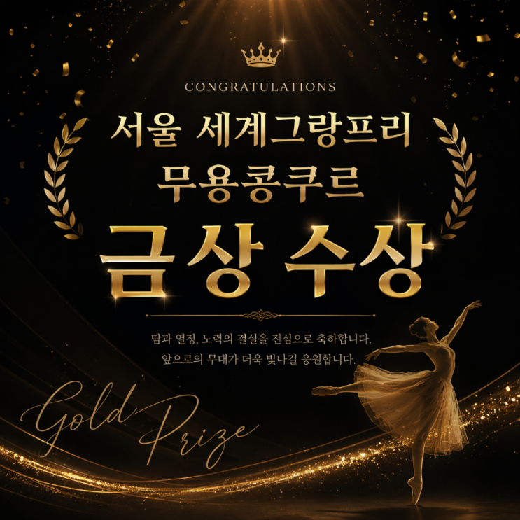 <26년도 세계그랑프리 무용콩쿠르 결과> 상명아트센터계당홀 서울 일정으로 올라온 김에 서울세계그랑프리 무용콩쿠르에 참가한 현서 이렇게 큰 무대는 처음이라 많이 떨고, 경연을 마치고 내려와 울기도 했지만 ✨ 금상 수상 ✨ 소중한 경험을 하나 더 쌓고 왔습니다♥️ 다음 무대에서는 우리 아이들도 좋은 성과를 낼 수 있도록 간절히 응원합니다 궁금하신점있으면 언제든지 연락주세요^^♡ 수업중일때는 전화를 못받아도 너그러운 양해부탁드립니다^^(바로 연락드리겠습니다^^♡) 방문상담은 예약후 편하게 말씀해주시면 너무감사하겠습니다^^ ♦️상담문의는 010 3427 2115 ♦️전공생....... <img src="https://blogthumb.pstatic.net/MjAyNjA0MjZfNDMg/MDAxNzc3MTg1ODIyNDk5.0vsjLCNzZ6PMEU2Nu-Fnv6aoCY-ITZh-3cWbKBaJ8qYg.qzev2L6YIu8_inTPG-RzkvN334m43LacNKAMO_1vbpIg.PNG/900%A3%DFfile%A3%DF000000003568720c83a5f6fea0efaed8.png?type=s3" />