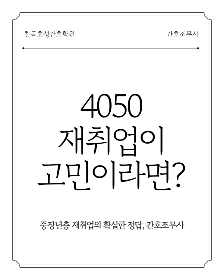 새로운 시작을 꿈꾸는 40대와 50대 분들이 가장 많이 하시는 고민은 아마도 나이에 대한 두려움일 것입니다. 공부를 시작하기에 너무 늦은 것은 아닌지, 자격증을 따더라도 나이가 장벽이 되어 취업이 안 되는 것은 아닌지 걱정하시곤 합니다. 하지만 간호조무사 분야, 특히 방문간호와 요양 서비스 영역에서는 여러분의 연륜과 인생 경험이 무엇보다 큰 경쟁력이 됩니다. 칠곡효성간호학원이 왜 중장년층 재취업의 확실한 정답인지 그 이유를 정리해 드립니다. 1. 나이가 곧 전문성이 되는 방문간호와 요양 분야 일반적인 직종과 달리 간호 및 돌봄 서비스 분야는 어르신들과의 정서적 교감과 공감 능력이 매우 중요합니다. 4050 세대가 가진 풍....... <img src="https://blogthumb.pstatic.net/MjAyNjA0MjFfMTUz/MDAxNzc2NzQ4MDczNzQx.qN37lDi0pwvAZ-tf2lc-pqAtdoH9qRfrdqDaT6Jly38g.4oGyEcgA82jfVFmd1IptLVFAPU3DhUGngA5qPthzPVMg.PNG/%C4%A5%B0%EE%C8%BF%BC%BA%B0%A3%C8%A3%C7%D0%BF%F8_%B0%A3%C8%A3%C1%B6%B9%AB%BB%E7_%C1%DF%C0%E5%B3%E2%C3%FE_%C0%E7%C3%EB%BE%F7.png?type=s3" />