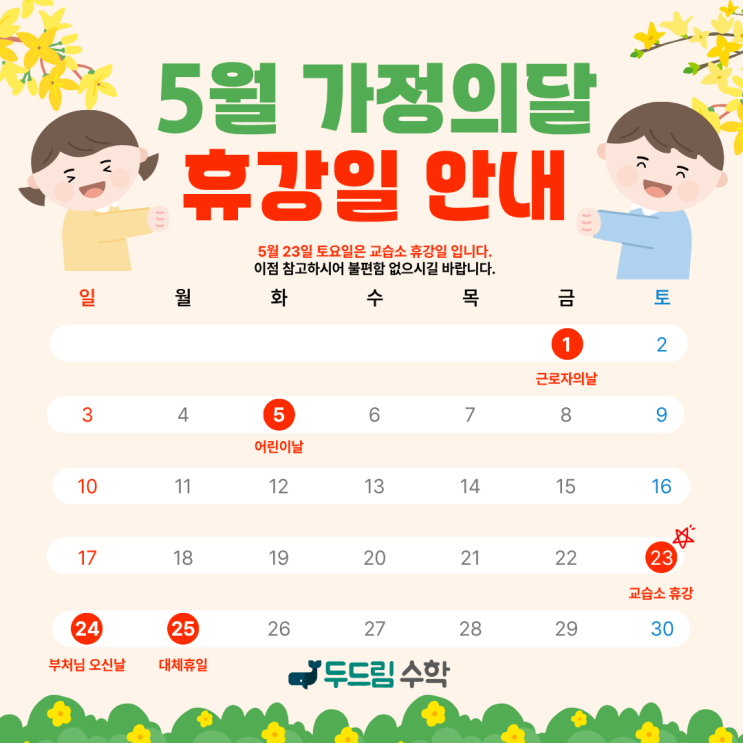 안녕하세요 단단하고 꼼꼼하게 수학합니다. 두드림수학 입니다. 날이 따뜻해지며 거리가 푸릇푸릇 해졌습니다~ 해가 진 저녁에도 산책하기 좋은 날씨가 이어지고 있는데요 날이 좋아서 인지 요즘 두드림 친구들도 부쩍 활기차게 등원하고 있습니다 :) 그럼, 곧 다가오는 5월 공휴일 안내 드리겠습니다! 1일: 근로자의 날 (휴강) 5일: 어린이날 (휴강) 23일: 교습소 자체 휴강 24: 부처님 오신 날 25: 대체공휴일 (휴강) 23일 토요일은 교습소 자체 휴강일 입니다. 이 점 참고 하시어 불편함 없으시길 바랍니다 :) 찾아오시는 길 경기 성남시 중원구 광명로 176 근린생활시설 A1블럭 1층 114호 두드림 수학교습소 ☎️상담 및 문의 010.6792.5....... <img src="https://blogthumb.pstatic.net/MjAyNjA0MTZfMTI0/MDAxNzc2MzEzODU2MTUx.kzKSChvXTZmdm8ZpcEdJ8tlNHCVsBXNxPOnexeORs7cg.iTPqjlBsFojEnd-XbYwVqp0WyqmBCMsuaElbgFZYtoog.PNG/0605_%C0%FC%C3%BC.png?type=s3" />