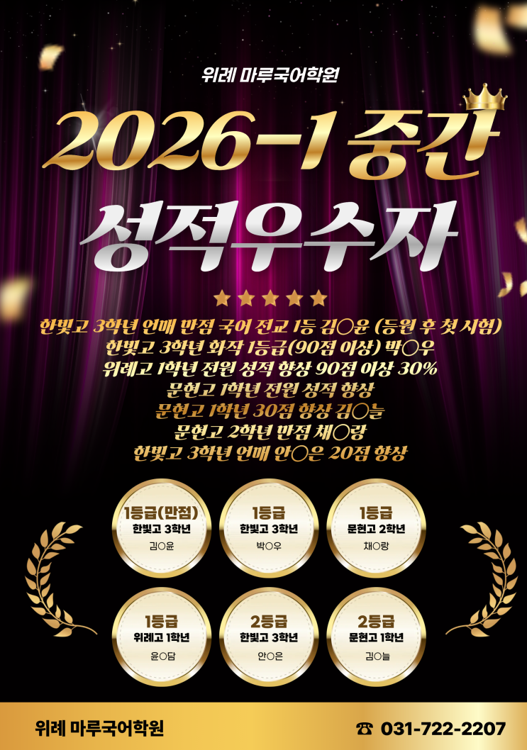 [위례 마루국어] 2026년 1학기 중간고사 성적 우수자 발표