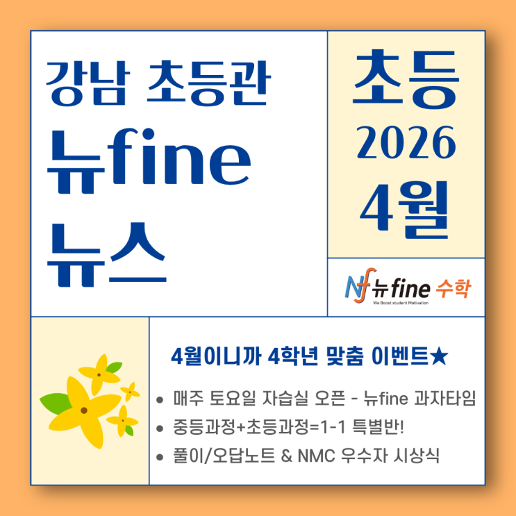 안녕하세요, 뉴fine 강남 초등관 입니다. 계절의 변화와 함께 일상에도 따뜻한 흐름이 더해지는 4월입니다. 뉴fine학원에서는 한 달간의 주요 소식과 아이들의 성장 과정을 담아 ‘4월의 뉴파인 뉴스’를 전해드립니다 4월이니까 4학년 맞춤 이벤트~!! 친구소개 이벤트 + 맞춤 특강 + 맞춤 클리닉까지 ✔ 친구소개 이벤트 친구가 입반테스트 진행+등록 > 소개한 재원생에게 선물이!! ✔ 이주희 팀장 직강 단기 특강 → 4학년 과정부터 어려워지는 대수 단원 ★ 완전 정복 ★ ✔ 4학년 대상 수요 클리닉 뉴fine이 궁금한 비재원생도 들어볼 수 있어요~! 뉴fine만의 풀이노트 작성방법도 미리 경험해보세요 5월 1-1 특별반 개설~! 중등 시작 + 초....... <img src="https://blogthumb.pstatic.net/MjAyNjA0MjBfNDcg/MDAxNzc2NjY4MTA1MzI3.P7HwdhorBJkBqAPlJabRVRBXD2AI2wXMdIlMlAz4LVkg.7sVE5l3JXRlAfp0tVl1Qk-nkcRhm9MfHsrOKI4SM_YAg.PNG/%B4%BAfine%B4%BA%BD%BA_ver.2.png?type=s3" />