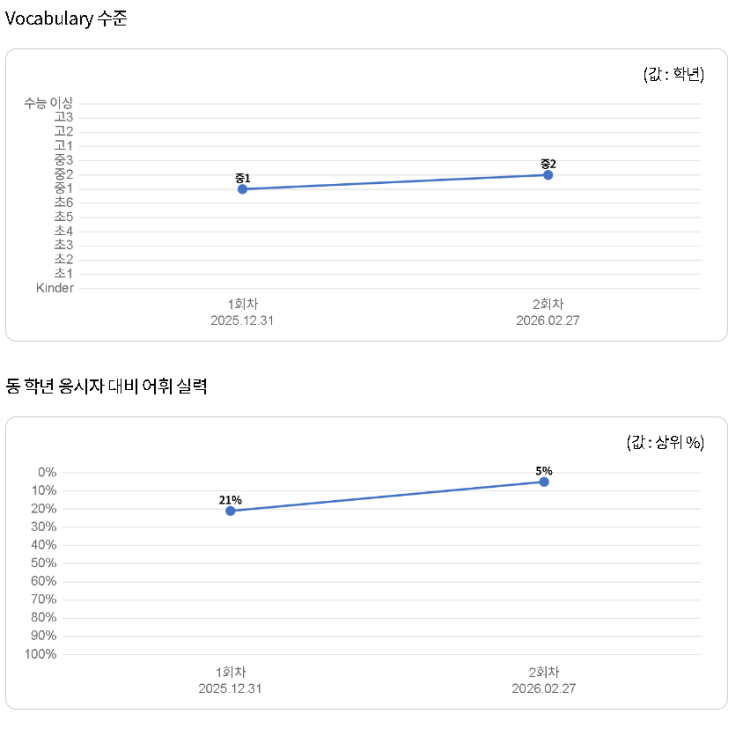 학부모님과 학생 여러분, 안녕하세요! 수능/내신 영어 1등급 대치탑영어학원입니다! 오늘은 제가 이전부터 꾸준히 강조했던 '어휘와 문법 학습의 중요성'을 실제 학생의 성취도 통계적 자료를 통해 객관적으로 보여드리고자 합니다. 많은 분들이 "단어 외우기도 바쁜데 문법까지 할 수 있을까?"라고 고민하시지만, 실제 데이터는 이 두 영역이 서로를 끌어주며 함께 성장한다는 것을 증명하고 있습니다. 대치탑 영어학원에서 2달간 학습한 중학교 1학년 A 학생의 사례를 함께 보실까요? 1. 어휘력: 중1 수준에서 중2 수준으로 점프 2025년 12월 31일: 상위 21% (중1 수준) 2026년 2월 27일: 상위 5% (중2 수준 도달!) 단 2달....... <img src="https://blogthumb.pstatic.net/MjAyNjA0MTdfMjcg/MDAxNzc2NDA2MTMzNjE3.E0pmBjKmrZCV2pyeFrk6uXOKtiOJL_dzoBDJdB3RgcMg.m5aV3nSW3YzF5G0tW2fdwi2FMNypVckAs96KJGm23l4g.PNG/20260413152518_%C1%DF1_%BE%EE%C8%D6_%C7%E2%BB%F3.png?type=s3" />