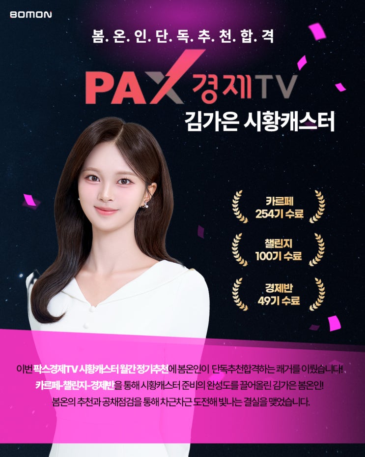 #봄온인의합격을축하합니다 #단독추천 봄온인의 방송진출을 진심으로 축하합니다. 2026 팍스경제TV 캐스터 / 김가은 단독추천합격 카르페 정규과정 254기 수료 챌린지 고급과정 100기 수료 경제반 49기 수료 김가은 학생이 단독추천합격을 했단 소식을 전해왔습니다. 그 동안의 열정과 노고에 감사드리며 모두의 마음을 담아 김가은 학생의 합격을 진심으로 축하합니다! 앞으로 멋진 방송 활동 기대하겠습니다. 카카오톡 : @봄온아카데미 02)706-5144 #아나운서 #아나운서아카데미 #아나운서학원 #아나운서학원추천 #아나운서합격 #아나운서지망생 #아나운서합격생 #아나운서합격전문 #아나운서합격자 #봄온아나운서아카데미 #봄온아카데미 #봄온....... <img src="https://blogthumb.pstatic.net/MjAyNjA0MjRfMTgx/MDAxNzc2OTg2MTMyODk3.N_snnz0aLEhRMu65hbzPqm52TQzgFLTizfC3Z13t_04g._HIjIib6ZGxY3otdFWHpe5OY0hoYcM0YHcZC9GWrFS8g.JPEG/0214_01.jpg?type=s3" />