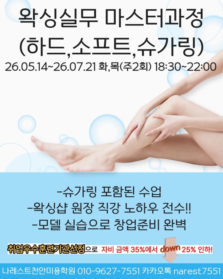 안녕하세요 나레스트천안미용학원 입니다. 왁싱실무 마스터과정(하드,소프트,슈가링) 26.05.14~26.07.21 화,목(주2회) 18:30~22:00 왁싱 분야에 관심이 있거나 창업, 취업을 목표로 실무 기술을 배우고 싶다면 주목해야 할 과정이 있습니다. 바로 5월 14일 개강하는 왁싱 실무 마스터 과정입니다. 특히 슈가링까지 포함된 커리큘럼으로 구성되어 있어, 보다 전문적인 기술을 배우고 싶은 분들에게 적합한 과정입니다. 요즘 많은 분들이 검색하는 천안 슈가링 국비지원 과정 중에서도 실무 중심으로 탄탄하게 구성된 교육이라 더욱 추천드립니다. 이번 과정의 가장 큰 특징은 왁싱샵 원장 직강으로 진행된다는 점입니다. 실제 현장에서 고객을 응....... <img src="https://blogthumb.pstatic.net/MjAyNjA0MjRfMTUw/MDAxNzc3MDI1MTgzOTUw.5gEgWpvPzuzp8BVeBi_4FHyDx8CIX0fWuk2UmChC2YQg.qnXY0WezXa_cLyzfW7z37St6UkpZSr2Q7iJK0ZIwLusg.JPEG/%C1%A6%B8%F1%C0%BB_%C0%D4%B7%C2%C7%D8%C1%D6%BC%BC%BF%E4._%2866%29.jpg?type=s3" />