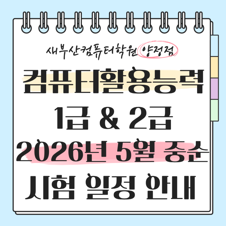 안녕하세요 새컴지기입니다 컴퓨터활용능력 2026년 5월 중순 1급, 2급 필기시험 일정 안내드립니다 ~2026년 5월 17일까지 응시 요일 및 시간 확인 후, 접수해 주세요! 2026년 5월 중순 컴퓨터활용능력 필기 1급 최신 일정 안내 컴활1급 부산상공회의소 A시험장 컴활1급 부산상공회의소 B시험장 1급 컴퓨터활용능력 필기 시험 개설 일자 확인 부탁드립니다 2026년 5월 중순 컴퓨터활용능력 필기 2급 최신 일정 안내 컴활2급 부산상공회의소 A시험장 컴활2급 부산상공회의소 B시험장 2급 컴퓨터활용능력 필기시험 개설 일자 확인 부탁드립니다 컴퓨터활용능력 자격증 준비하시는 분들이 가장 많이 하....... <img src="https://blogthumb.pstatic.net/MjAyNjA0MjdfMTg1/MDAxNzc3MjY2MzgzMzE3.tBII4n692gd2jThuHZFepMJSioh8IRa3Mp01LleLQQAg.xJou_QY_QGs9Fye6a6g2DF8-3IGh-_LpJgNmyk-oltgg.PNG/%C4%C4%C8%B0%BD%C3%C7%E8%C0%CF%C1%A4%C7%A5%C1%F6%28%BA%ED%B7%CE%B1%D7%BF%EB%29.png?type=s3" />