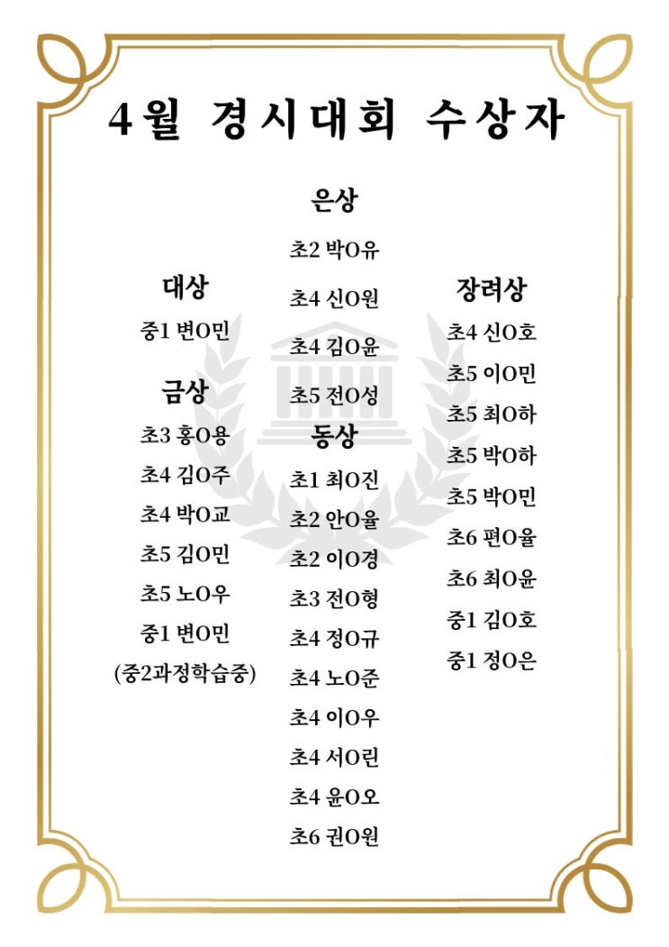 경시대회 준비를 따로 하지않고 평소 실력으로 치루고 있어 매월 아이들의 성장하는 모습을 보는 재미가 쏠쏠합니다 아쉬움이 남는 친구들은 다음달 경시대회까지 좀더 정진할수 있게 도와줘야겠다는 다짐도 한답니다. 경시대회는 아이들뿐만 아니라 강사진들에게도 되돌아보는 계기가 되고 있습니다. 4월은 꾸준히 도전해온 친구들의 첫 성과가 있어서 기뻤답니다 또한, "선행은 이렇게 하는것이다"라는 정석을 보여주듯 현행학습에선 대상을, 선행학습에선 금상을 받은 친구가 있어 뿌듯한 결과였답니다 5월 경시대회에서는 더 많은 친구들이 도전하고 좋은 결과를 얻을수 있기를 바라봅니다 #딥매쓰 #구서동수학학....... <img src="https://blogthumb.pstatic.net/MjAyNjA0MTZfODIg/MDAxNzc2Mjk5NTQwMDA3.g9qeuaOYVy7q4YG3espmrQG7BS7Abf2O6jucthUOdC4g.dM7LLLCsxtc8fCQBingMENky1cYgCKsSVq44Q5jiRHwg.JPEG/1775992661909.jpg?type=s3" />
