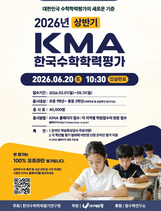 2026년 상반기 KMA 한국수학학력평가 현재 접수 중입니다. 5월부터는 우리 더기쁜수학 친구들도 열심히 준비해 볼 예정입니다. 객관적인 실력 점검과 더불어 학습에의 성취감, 수학에의 자신감도 얻을 수 있는 좋은 기회라고 생각됩니다. 응시를 원하시면 상담 문의 주세요 :) 네이버폼 상담 예약 링크 https://naver.me/5A3d3Ipt 문자, 전화 상담 예약은 010-5614-1095 (수업 중에는 통화가 어려우니 문자 남겨주시면 확인 후 연락드리겠습니다.) 갈곡초등학교 도보 3분 이내 강남마을 4단지 상가 2층 <더기쁜수학> (세븐일레븐 편의점 바로 위층) <img src="https://blogthumb.pstatic.net/MjAyNjA0MjNfMTE2/MDAxNzc2OTE5NTY1OTQy.iZHr1W6p3jINvUppCkK4Woz7m9Vwtib4ChRx0gwxwR0g.VF3z-na71e2bbaQuYvZyFCh3_giPlBwbe7-GAjNbJxwg.JPEG/2026-%BB%F3%B9%DD%B1%E2-%BA%EA%B7%CE%BD%B4%BE%EE-%C7%D0%BB%FD%BF%EB%28%BA%D0%C7%D2%C6%E4%C0%CC%C1%F6%29.jpg?type=s3" />