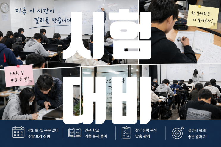 안녕하세요. 수학을더하다학원입니다. 요즘 학원은 완전히 시험 분위기입니다. 강의실에 들어오면 바로 느껴질 정도로 공기가 조금 더 조용하고, 집중도가 확실히 다릅니다. 문제 한 장이라도 더 풀어보려는 모습들, 틀린 문제를 다시 붙잡고 있는 시간들, 그 옆에서 계속 설명을 이어가는 선생님들까지. 이 시기에는 학원 전체가 한 방향으로 움직이고 있습니다. 요즘은 다들 바쁨의 연속~~!! 학생들은 부족했던 단원을 다시 정리하고, 틀린 문제를 반복해서 풀고, 시간 안에 풀어내는 연습을 계속하고 있습니다. 선생님들도 학생마다 막히는 부분을 하나씩 짚어보고, 필요한 문제를 골라주고, 이해될 때까지 설명을 이어가고 있습니다. 조용하....... <img src="https://blogthumb.pstatic.net/MjAyNjA0MjNfMTkg/MDAxNzc2OTE2ODAzMDUy.jC0MieJWkSyuJXrVn143ph9ZxSBcXK7fIotKU8kxPpsg.NI3nOAXm9SrvEGTwWV6vNsJhonIfeRduD-pxMtfEiWkg.PNG/383fcec2-bd7f-47ea-9ee4-f19b6d60a470.png?type=s3" />