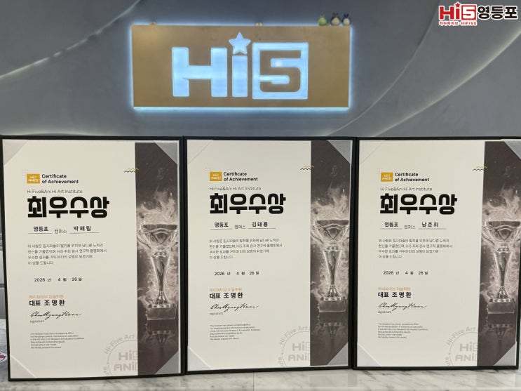 안녕하세요~! 영등포 Hi5(하이파이브) & AniHi(애니하이) 미술 학원입니다. 지난 4월 26일 진행된 하이파이브 강사 연구작 품평회에서 본원이 ‘3관왕’을 달성했습니다! 디자인, 애니메이션, 회화 전 과목에서 최우수상 배출이라는 결과로 강사진의 실기력과 연구 성과를 확실하게 증명해냈습니다. 이번 연구작 품평회와 함께 진행된 고3 입시생 연합시험을 통해 학생들의 현재 실기 수준을 객관적으로 점검하고, 앞으로의 학습 방향까지 구체적으로 설정하는 시간을 가졌습니다. 시험 작품에 대한 강평은 각 반 선생님들께서 순차적으로 진행될 예정입니다 :) 하이파이브 미술학원은 강사진 전원이 꾸준한 실기 연구를 이어가며 학생....... <img src="https://blogthumb.pstatic.net/MjAyNjA0MjhfMzkg/MDAxNzc3MzU2NTk3Nzg3.bOwYnITf6MNJah6tM6gbAR4nO8sljJzqQG1DU5DBpNAg.vVkffp63FXkAvR7kS6JHhBSTNEBZ58OG3p1qHlrbMNsg.JPEG/2026_4_27_19_23_51_487_597i_3.jpg?type=s3" />