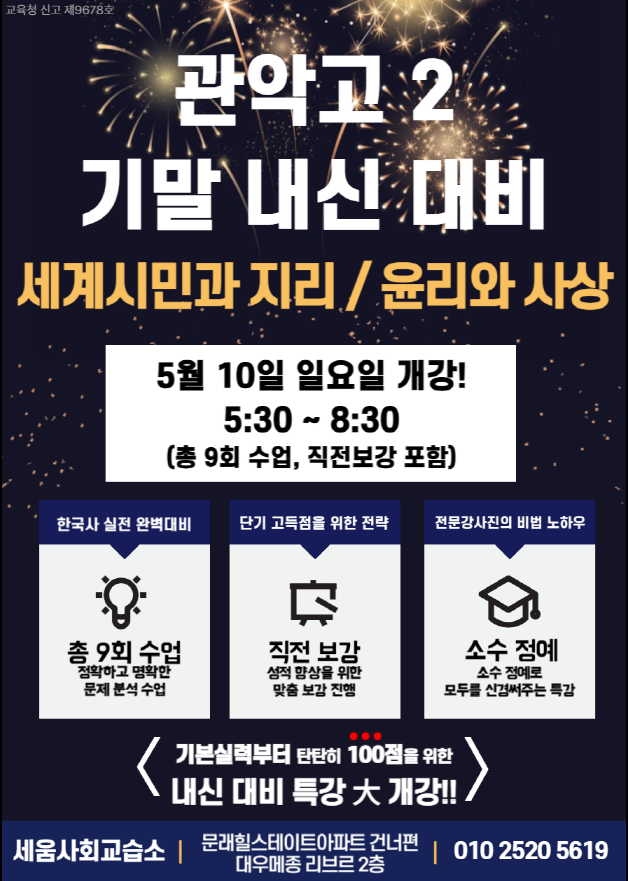 *관악고2* 기말고사 내신대비 <세계지민과 지리 / 윤리와 사상> #### 5월 10일 일요일 개강 #### 일요일 5:30~8:30 <세계시민과 지리 + 윤리와 사상> 관악고2 기말내신 대비반 진행합니다. 1회...1:30씩 두 과목...3시간 수업으로 내신대비 합니다. 1:1 개인 수업 혹은 팀 수업을 원하는 학생은 010-2520-5619 문의 주세요~ 감사합니다.!! *^^* 고등 수강료 1회 2시간 5만~ 고등 수강료 1회 3시간 7만~ 교육청 신고 제 9678호 <img src="https://blogthumb.pstatic.net/MjAyNjA0MjlfNzAg/MDAxNzc3NDY1NTY3Mzk5.R_4T4rAzXZfQEzqE6Wb4WXlvPWygp1k8WdlrcSdru-4g.83NvychLDQkbUhM13o6bxASVVBRAakqUX8wHqycKJIkg.PNG/1.png?type=s3" />