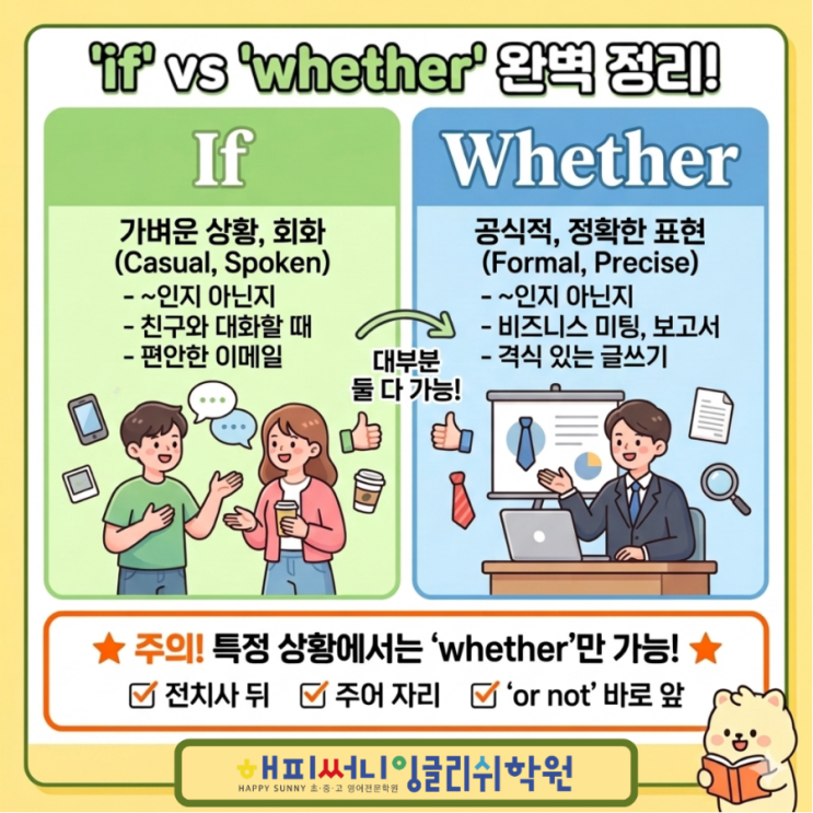 안녕하세요. 청주 가경동 영어아웃풋교육전문가 해피써니잉글리쉬학원입니다. 벚꽃의 꽃말이 '중간고사'라는 것을 알고계신가요? 예쁘게만 느껴지는 벚꽃이 만발하다는 것은 우리 중,고등 학생들에게는 곧 중간고사기간이라는 의미입니다. 이렇게 예쁜 날, 열심히 시험공부하는 우리 학생들 모두모두 응원합니다. 해피써니친구들도 열심히 중간고사대비 수업을 하고 있습니다. 경덕중과 솔밭중 3학년 학생들이 공부하고 있는 동아(윤) 교재의 타겟문법을 살펴보겠습니다. 1. 기본 차이 if = “~인지 아닌지” (가벼운 상황, 회화) whether = “~인지 아닌지” (공식적, 정확한 표현) 대부분 둘 다 가능하지만, 특정....... <img src="https://blogthumb.pstatic.net/MjAyNjA0MjFfMTYy/MDAxNzc2NzYwODEzNjAw.1fZUj22CCWPsE5rIhlAohgSucgfqgSNg7V3Kysbagxgg.SA1xAn0OCiCAsD5o84VbK0FvpvLeEk0ZNNscka772aIg.PNG/900_1776760415945.png?type=s3" />