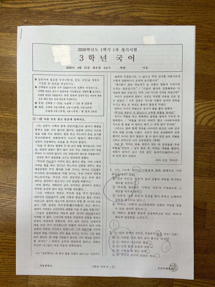 오늘(화) 저동중학교 국어시험이 있었다. 봄나무, 박씨전, 연 등의 문학작품과 4단원 <문제 해결하며 읽기> 의 비문학 글들이 시험범위이다. 문법이 들어가지 않아서 문제들도 대체로 무난하고 평이한 시험이었다. 문학은 작품의 작중 상황을 이해하기만 하면 풀 수 있는 문제들이고, 4단원 문제들도 평범했기에 대체로 좋은 결과를 얻었을 것을 예상된다. 중3 국어는 그리 어렵지가 않아서 조금만 공부해도 좋은 성적이 나오는 과목이다. 그렇다고 해서 중3 시기에 국어공부를 하지 않으면 고등학교에 진학했을 때 모의고사와 내신시험에서 좌절할 수도 있다. 지금 국어과목이 쉬을 때 지금 많은 공부를 해야 한다. 고등학교 첫 모의고사....... <img src="https://blogthumb.pstatic.net/MjAyNjA0MjFfMjAy/MDAxNzc2Nzc5MzMzNzI4.0GiLc1R6KPy9HMzc6Wyr1qWcIcVeFS8PvU01uh8YueIg.4N6rAm0lHtZJfKCvx4kuC_kUfYTF2msUH4oYwT6xsjsg.JPEG/%C0%FA%B5%BF%C1%DF3_%BD%C3%C7%E8%C1%F6.jpg?type=s3" />