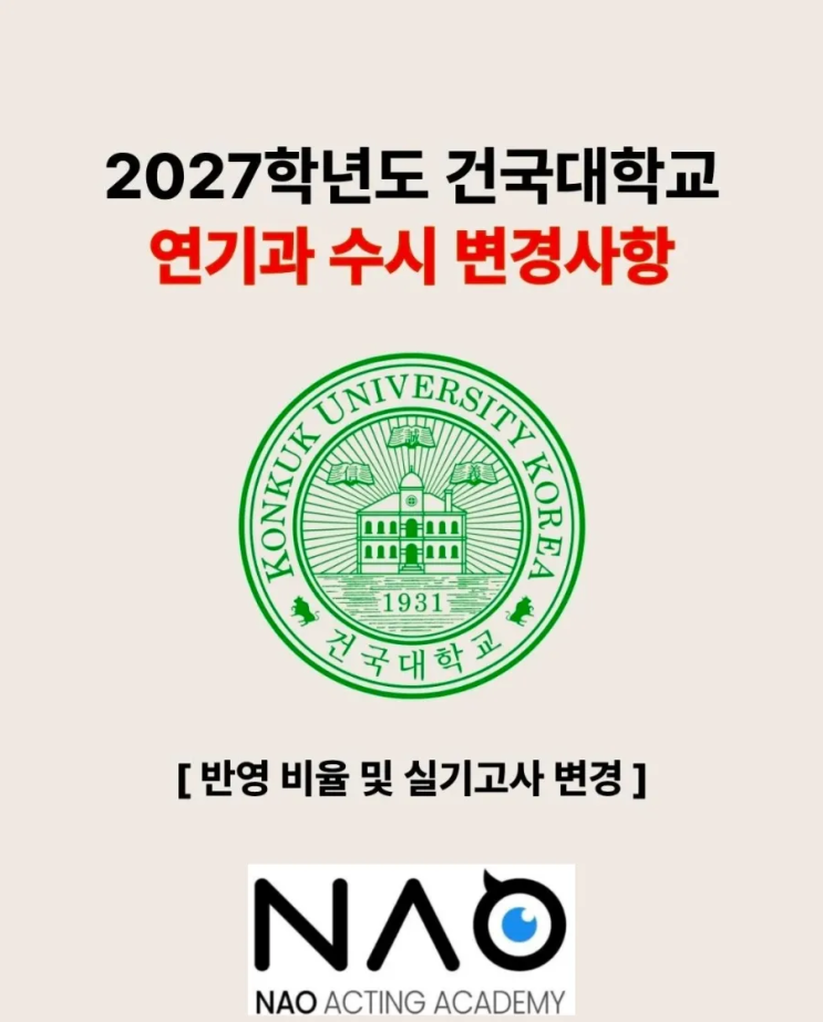 안녕하세요! 나오연기학원입니다. 건국대학교매체연기학과 2027학년도 수시모집요강 입니다~ 건국대학교 매체연기학과 2027학년도에 이 학과의 전형 구조가 전면 개편되었는데요~ 작년엔 1단계에서 영상을 제출하고, 2단계에서 내신과 실기를 함께 반영하는 방식이었다. 올해는 다르다. 1단계: 학생부 100%로 20배수 선발. 2단계: 실기 100%. 순서가 완전히 뒤집혔다. 먼저 내신으로 걸러내고, 통과한 학생만 실기로 최종 선발하는 구조다. 무엇이 달라졌는지, 무엇을 어떻게 준비해야 하는지 지금 정리한다. 전형 개요 전형명: 연기우수자 전형 (실기/실적 위주) 모집인원: 15명 지원자격: 일반고, 자율고, 특수목적고, 영재고, 특성화 고, 검정....... <img src="https://blogthumb.pstatic.net/MjAyNjA0MjNfMTk2/MDAxNzc2OTIxMDEwNzk0.hOascauQR7bkCiN_sBqY_Der38Zdl7mwf4cF2oxIriQg.HJjPzbwPUXNH07DJ3Tb9wjftq28ViKzlfzIYbPN0k1Ug.PNG/900_20260423_140759_0000.png?type=s3" />