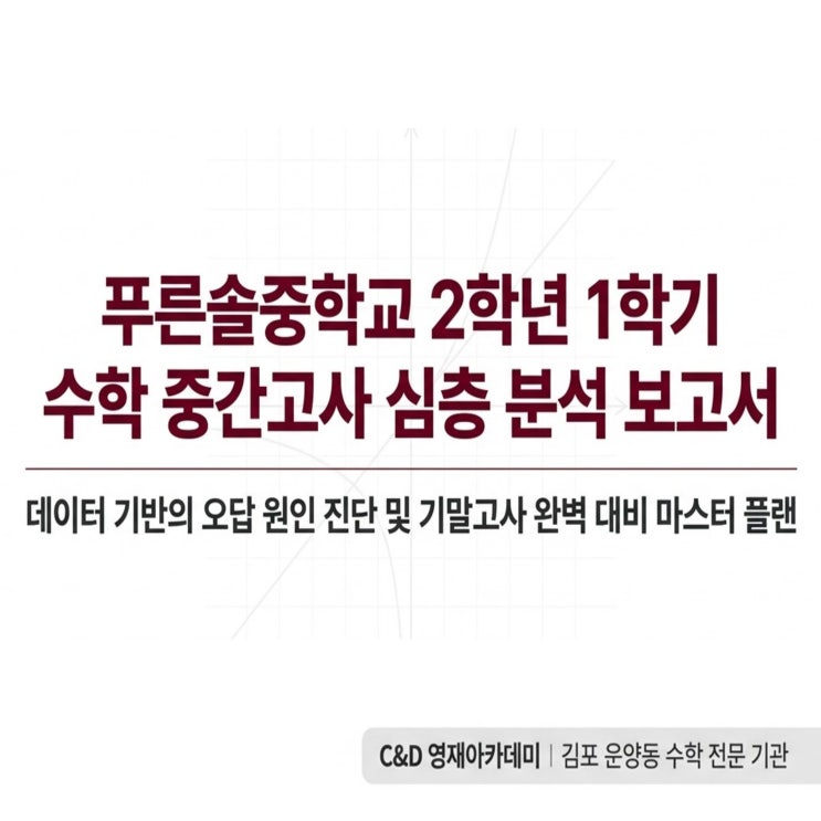 안녕하세요 학부모님 김포 운양동 수학의 올바른 기준, 씨앤디 아카데미입니다. 푸른솔중학교 2학년 학생들의 첫 수학 지필평가가 마무리되었습니다. 중학교 2학년 첫 시험인 만큼 학생들도, 지켜보시는 학부모님들께서도 긴장과 걱정이 많으셨을 텐데요. 이번 시험이 어떻게 출제되었는지, 우리 아이가 어떤 부분에서 어려움을 겪었을지, 그리고 다가올 기말고사는 어떻게 대비해야 할지 꼼꼼하게 짚어드리겠습니다. 시험 개요 및 전체적인 출제 경향 (시험 구성) 이번 푸른솔중 2학년 1학기 중간고사는 범위:'유리수와 순환소수'부터 '일차부등식 활용'까지 문항 구성: 총 23문항 (선택형 21문항 + 논술형 2문항) 배점: 선....... <img src="https://blogthumb.pstatic.net/MjAyNjA0MjhfMTEz/MDAxNzc3Mzc3NDQ3NjYy.7LtC8RkOw3p-BIsM14dK38MUNlsPzAMknzx3pvXfuZIg.65kLmJ5VXgo27WTPOPndHOCoan7WnjRkPm5AAnGBcYwg.JPEG/%C1%A6%B8%F1%C0%BB_%C0%D4%B7%C2%C7%D8%C1%D6%BC%BC%BF%E4..jpg?type=s3" />