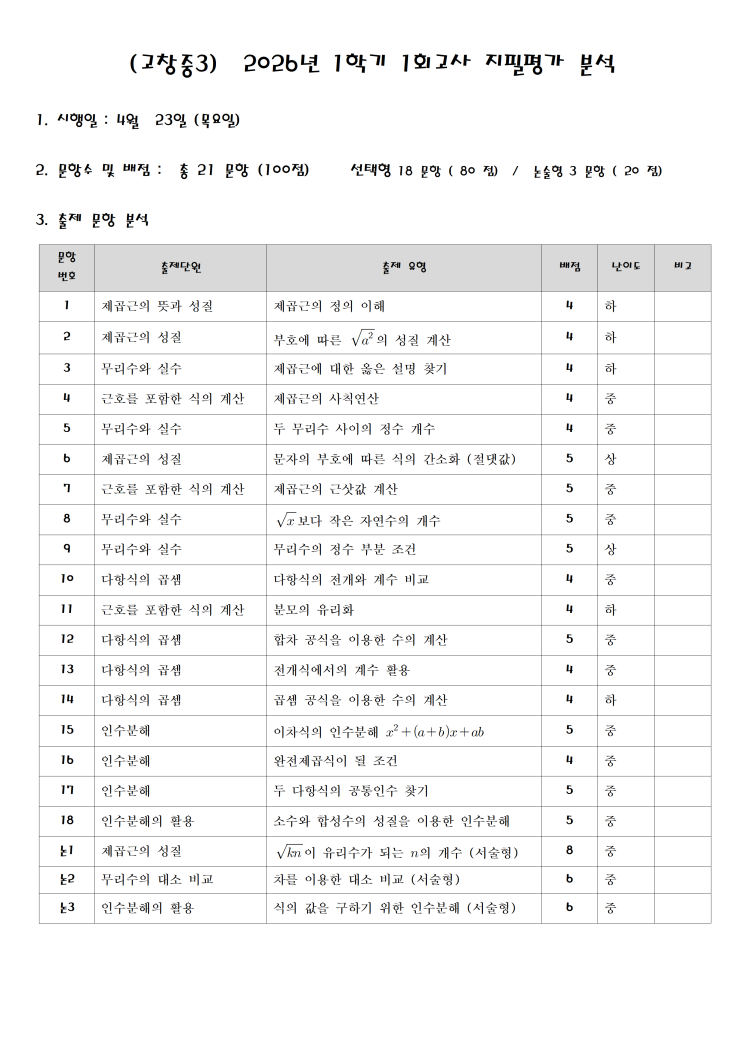[장기동수학학원] 26학년도 고창중 3학년 1학기 중간고사 기출분석