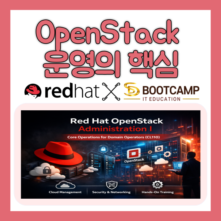 OpenStack 실무 운영의 시작, CL110으로 프라이빗 클라우드를 완성하세요 기업의 IT 인프라는 지금 빠르게 변화하고 있습니다. 단순한 서버 운영을 넘어, 이제는 클라우드 기반 인프라 구축과 운영 역량이 필수가 되었습니다. 특히, 엔터프라이즈 환경에서 안정성과 확장성을 모두 만족시키는 Red Hat OpenStack Platform은 프라이빗 클라우드 구축의 핵심 솔루션으로 자리 잡고 있습니다. 이러한 흐름 속에서, 레드헷 공식 커리큘럼을 기반으로 한 실무 중심 교육을 솔데스크강남학원이었던 SD부트캠프에서 직접 운영합니다. 교육일정 교육은 5월 11일 개강 예정입니다. 교육 일정 안내 교육 일정: 2026년 5월 11일(월) ~ 5월 15일(금) 교육 기....... <img src="https://blogthumb.pstatic.net/MjAyNjA0MTZfMTE4/MDAxNzc2Mjk3NTY0NjQ1.ssQA0J6ImFWGFI1_PPzefejTbnT147Siq7OIPG1eVsQg.GQVX3-su-zzvrDCYnUI8qilvwzN-U7VknrjDkgEDzgog.PNG/001.png?type=s3" />