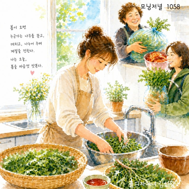 #오늘의글감 #글디자이너_김선황 계절을 맛 보고 있습니다. * 2026년 4월 29일 화요일 모닝저널 1058 나, 사랑받는구나 어젯밤, 퇴근 후에 마지막으로 남은 나물을 씻었습니다. 한 번에 끝날 일이 아니었습니다. 흙이 많아 몇 번이고 물을 갈아가며 씻어야 했습니다. 그 시간이 번거롭지 않았습니다. 지난 주말 식당 아주머니께서 건네주신 나물이었습니다. 예의상 “주시면 잘 먹겠습니다”라고 했던 말이, 정말 한 보따리의 선물로 돌아왔습니다. 거기에 김치까지 함께였습니다. 그리고 또 한 번, 오래된 인연에게서 나물이 도착했습니다. 시험 기간이라 가지 못한다고 했더니, 직접 가져다주겠다고 했습니다. 20년을 이어온 관계는 그렇....... <img src="https://blogthumb.pstatic.net/MjAyNjA0MjhfMTA2/MDAxNzc3MzQxMDc4MTc5.jcKBze3Fhc1dJnWzv8epkP4WBujknWBkq3GNZx1e7bsg.7J49alvUDM3M8kM20WKsBDNbsh_u0ItzJyx-VGxZM4Ag.JPEG/900_20260428094053.jpg?type=s3" />