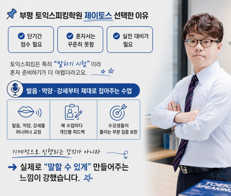이직 준비 때문에 토익스피킹 점수를 빠르게 만들어야 하는 상황이었어요. 솔직히 독학도 고민했지만 저는 강제성이 없으면 절대 안 하는 스타일이라 결국 부평 토익스피킹학원을 선택했습니다. 결론부터 말하면 이 선택은 진짜 잘한 선택이었어요. 부평 토익스피킹 제이토스 선택 이유 ✔ 단기간 점수 필요 ✔ 혼자서는 꾸준히 못함 ✔ 실전 대비가 필요 토익스피킹은 특히 “말하기 시험”이라 혼자 준비하기가 더 어렵더라고요. 발음·억양·강세부터 제대로 잡아주는 수업 처음 수업 들으면서 느낀 건 단순히 템플릿만 외우는 수업이 아니라는 점이었어요. 발음, 억양, 강세를 하나하나 교정 매 수업마다 개인별 피드백 수강생....... <img src="https://blogthumb.pstatic.net/MjAyNjA0MjRfMTkw/MDAxNzc3MDEyNzQzMzIz.7YnNQxNiDMwtxGIC7D1GYrNLaga9Y3q6MHaK5LPK8hog.L-CJ5s9VKFU4WCEM5neA-CDJMQwfL4BnmKAjAoFM5skg.PNG/c133fa4e-a126-41d1-b6f0-a1bf2133be6c.png?type=s3" />