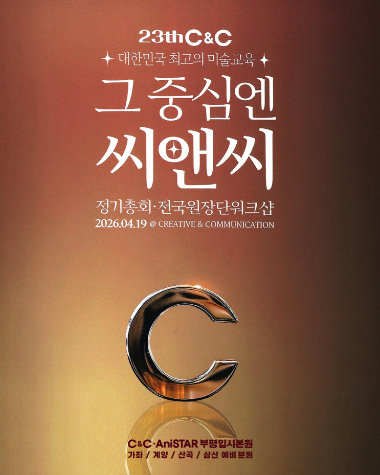 안녕하세요!~^^ 또한번 뵈요 봄을 알리는 벚꽃이 지나가고 이제는 여름을 알리는 가벼운 옷차림 요번 소식은 전국에 미술학원도 많은데 26년의 봄과 함께 시작을 알리는 전국원장단 및 전임강사 워크샵이 경기도 양평에서 있었습니다. 전국에서 모인 자리라 많은 원장님들과 선생님들이 참여 했습니다. 25년도 씨앤씨미술학원의 성과와 아이들을 지도해 주신 선생님들에 대한 포상도 감사한 마음도 같이 전달 했고 전국에 씨앤씨미술학원이 어떻게 확장하고 성장 했는지를 한 분에 볼수 있는 뜻깊은 자리였습니다. 저희 학원도 참여해서 지난해를 돌아보는 자리가 되었습니다. ~~^^ 요번 워크샵에서 눈여겨 봐야 할 점은 전국에 씨앤씨미술학원 식....... <img src="https://blogthumb.pstatic.net/MjAyNjA0MjVfMjgw/MDAxNzc3MDk1MjYxMDA2.u37Dx6T8REeKIABIzbldRWfLzXrKRm0mHA2_M-qNunwg.NqnM4UkBnChc-4dQGrvBEdPuJu4R9wzEHaUbS591ksUg.PNG/KakaoTalk_20260422_165631888_03.png?type=s3" />