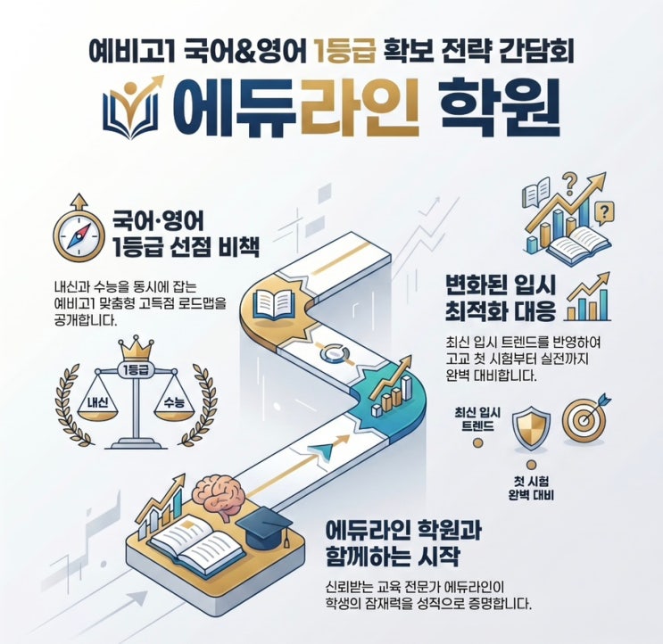 2026년 7월 24일 금요일 오후 7시 예비고1 국어&영어 1등급 확보를 위한 간담회 중학교 3학년 학생들, 아직 4월이라 고등학교 준비는 나중에 해도 된다고 생각하시나요? 많은 학생들이 고1 첫 시험에서 충격을 받습니다. 중학교 때 잘하던 학생이더라도, 고등학교 국어·영어 시험 앞에서 성적이 흔들립니다. 중학교 공부법으로는 고등학교에서 좋은 성적을 받기 힘들기 때문입니다. 지금 중3인데 고등학교 국어&영어 공부를 벌써 시작해야 하나요? 고등학교에 입학한 뒤 시작하면 늦습니다. 입학 후에는 학교 적응, 수행평가, 학습량 증가로 학업 기초를 다질 시간이 부족합니다. 국어·영어는 단기간에 성적을 올릴 수 있는 과....... <img src="https://blogthumb.pstatic.net/MjAyNjA0MjNfMjQ5/MDAxNzc2OTAxNzAzNzI2.vOtW-Tuj-OGIMVKAH-DvYcE6OcEj7PBwi-tYm7auTQcg.tYICRZZQ4p-LI6cNjYV7NIylncrxImtY_KywvWKW1cgg.JPEG/IMG%A3%DF1199.jpg?type=s3" />