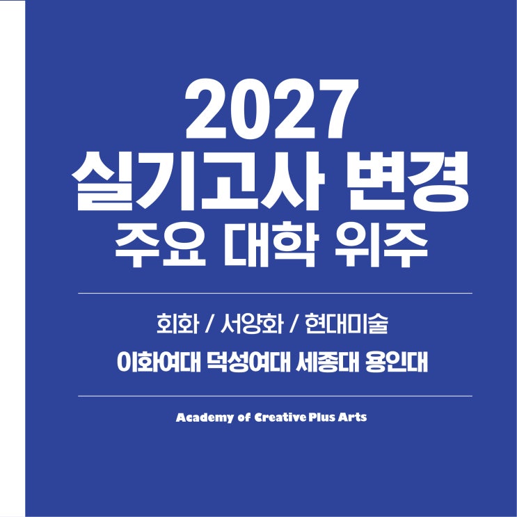안녕하세요~ 아이들이 행복한 상상을 마음껏 펼칠 수 있는 곳 완주 봉동 창의더함 미술학원 입니다 2027학년도 미대 입시에서는 실기 유형이 전반적으로 “표현력 중심”으로 재편되는 흐름이 뚜렷합니다. 이를 위해, 오늘은 미대 입시생들을 위한 2027년 서양화 대학 실기고사 변경내용을 한 눈에 보기 쉽게 정리해왔어요! 2027년 이화여대 조형예술학부, 섬유패션학부, 디자인학부 실기 변경내용 먼저 이화여대 미대는 조형예술학부, 섬유패션학부, 디자인학부 정시에서 모두 실기 방식이 통일되었습니다. 기존의 세부 전공별 차이를 줄이고, “제시된 대상과 주제를 주어진 재료로 표현” 하는 방식으로 바뀌면서, 관찰력뿐 아니라 해석력과 구....... <img src="https://blogthumb.pstatic.net/MjAyNjA0MjdfMTU1/MDAxNzc3MjgyNjc2ODEw.W2heD7H6FKKa5eouAGsiNPZfv9NoajGXfKO41BGEHR0g.7TspuzEu_CdaRjr_x3pwRvVSxUhIPBK8ahq9A8ZywXUg.JPEG/%B4%EB%C1%F6_111.jpg?type=s3" />